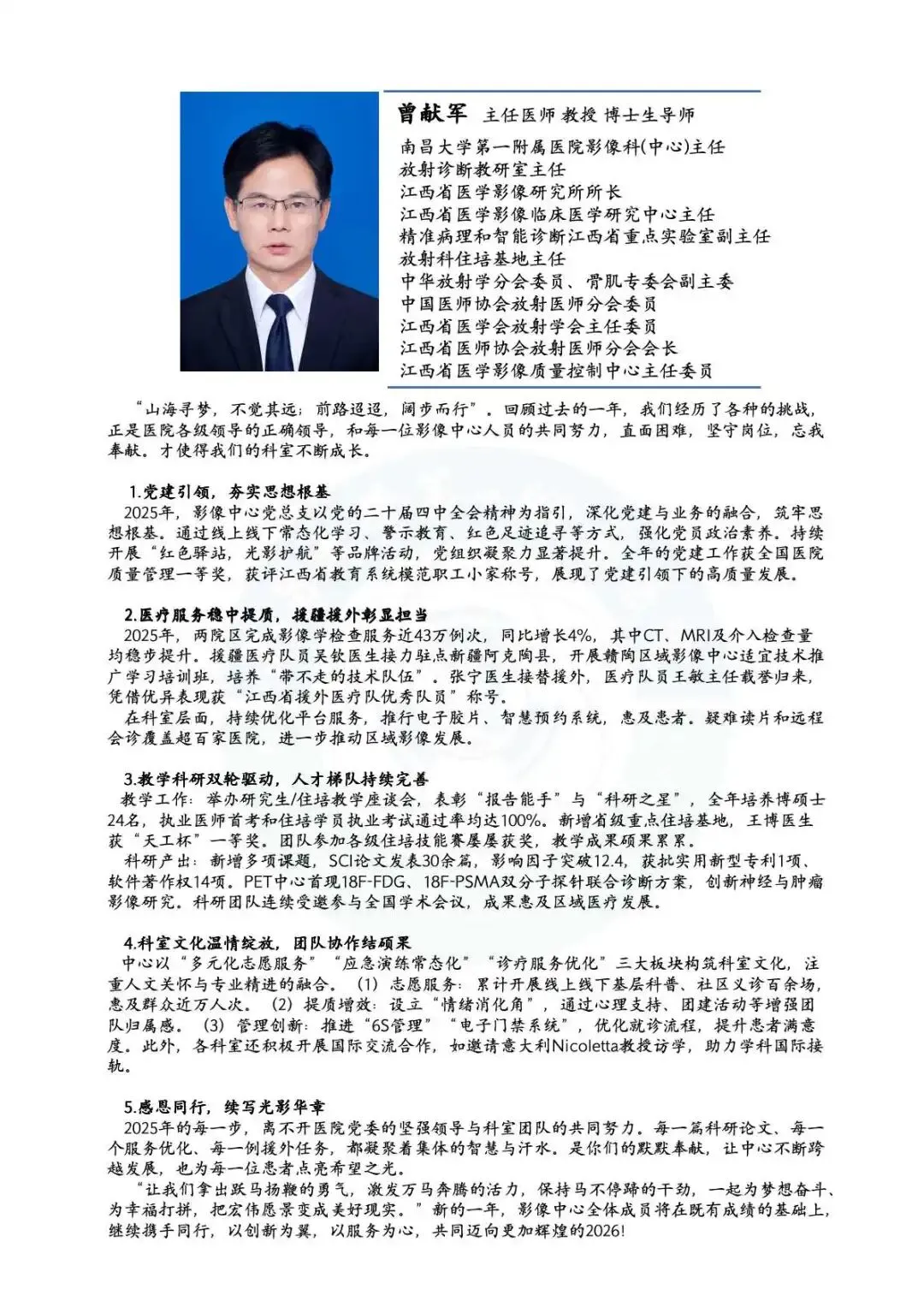 2025年的每一步,离不开医院党委的坚强领导与科室团队的共同努力。每一篇科研论文、每一个服务优化、每一例援外任务,都凝聚着集体的智慧与汗水。是你们的默默奉献,让中心不断跨越发展,也为每一位患者点亮希望之光。