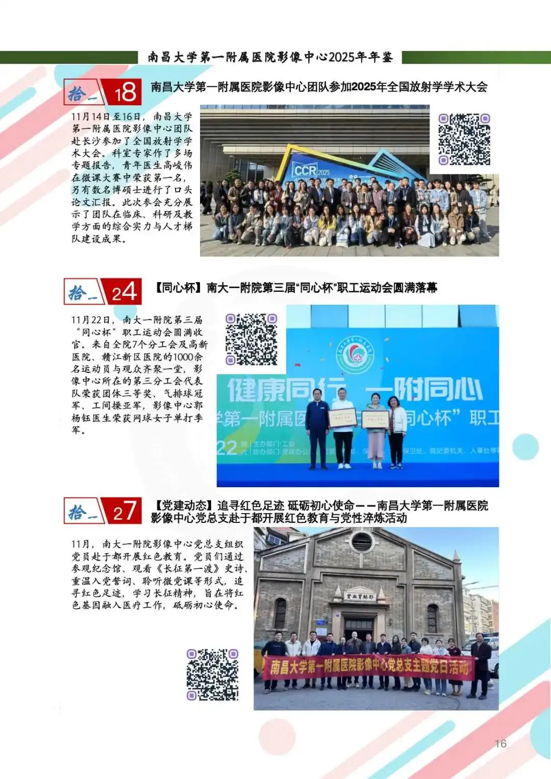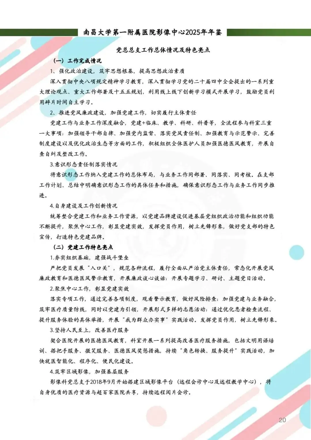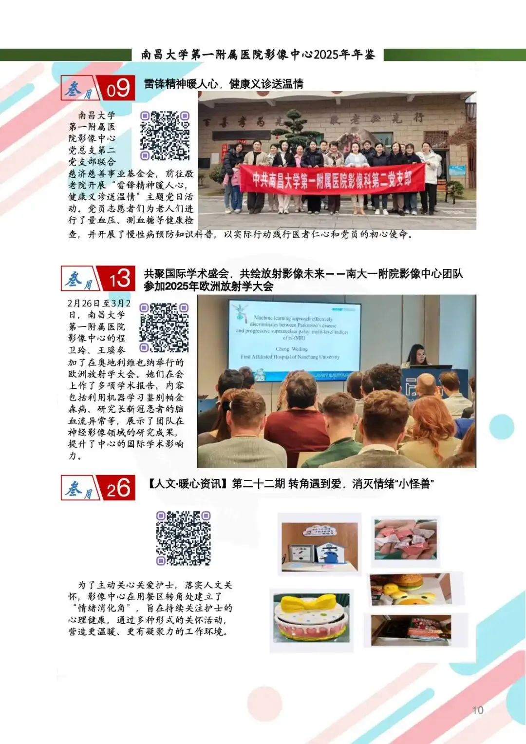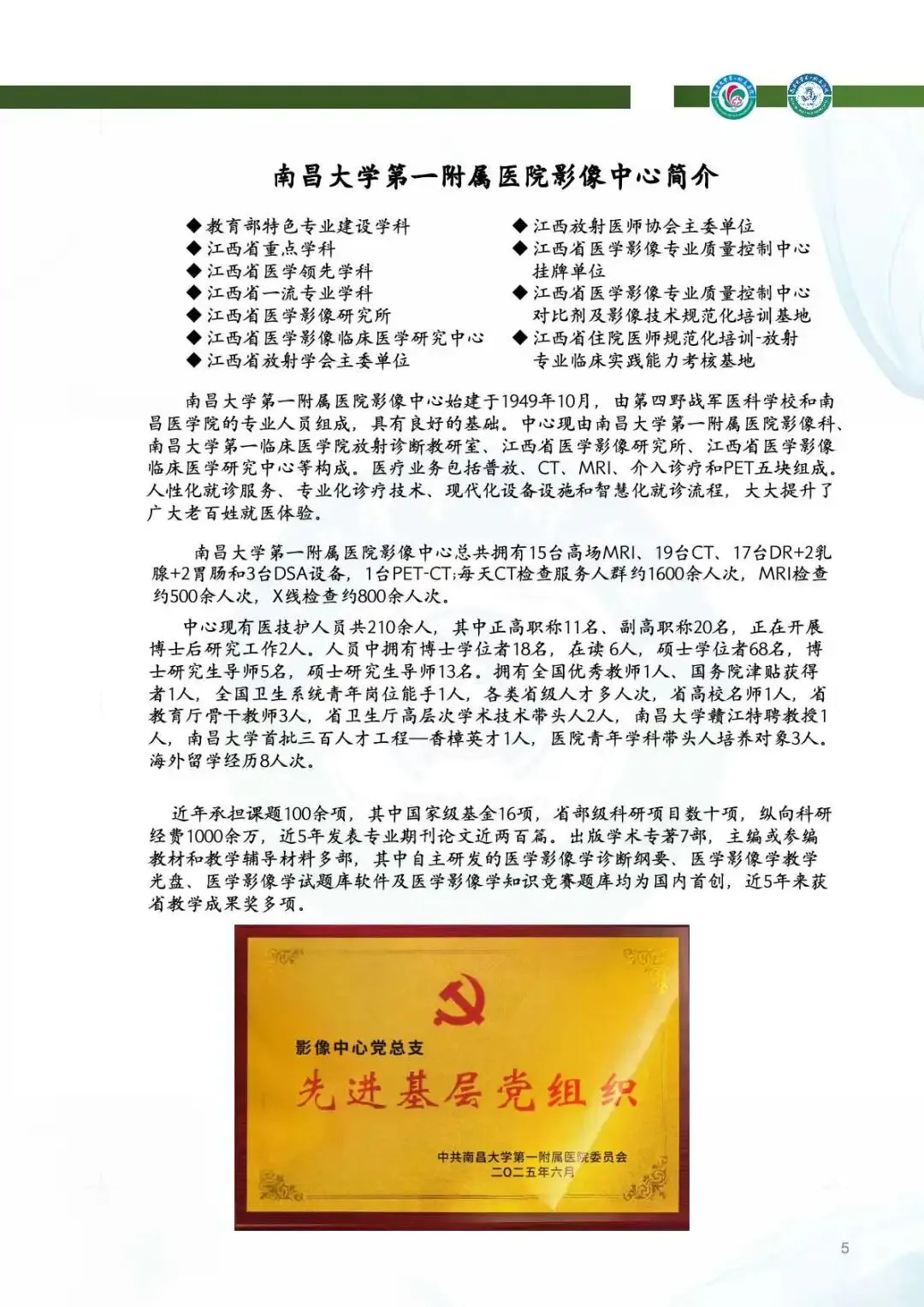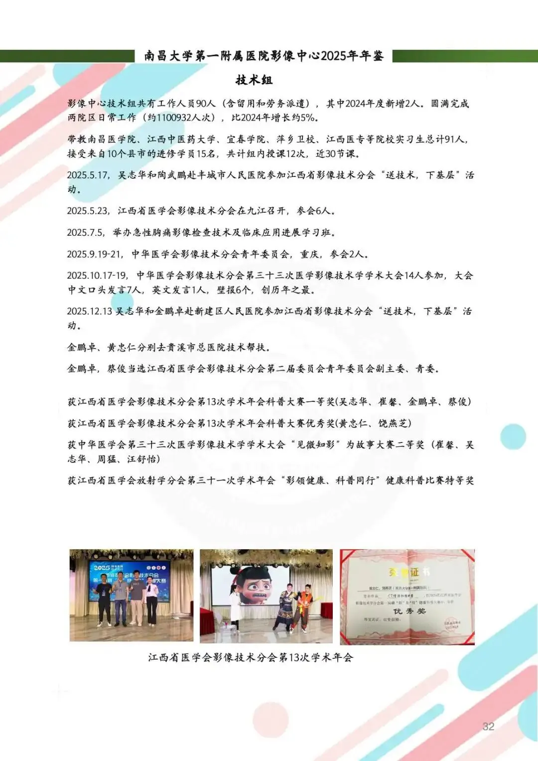 2025年,影像中心党总支以党的二十届四中全会精神为指引,深化党建与业务的融合,筑牢思想根基。通过线上线下常态化学习、警示教育、红色足迹追寻等方式,强化党员政治素养。持续开展“红色驿站,光影护航”等品牌活动,党组织凝聚力显著提升。全年的党建工作获全国医院质量管理一等奖,获评江西省教育系统模范职工小家称号,展现了党建引领下的高质量发展。