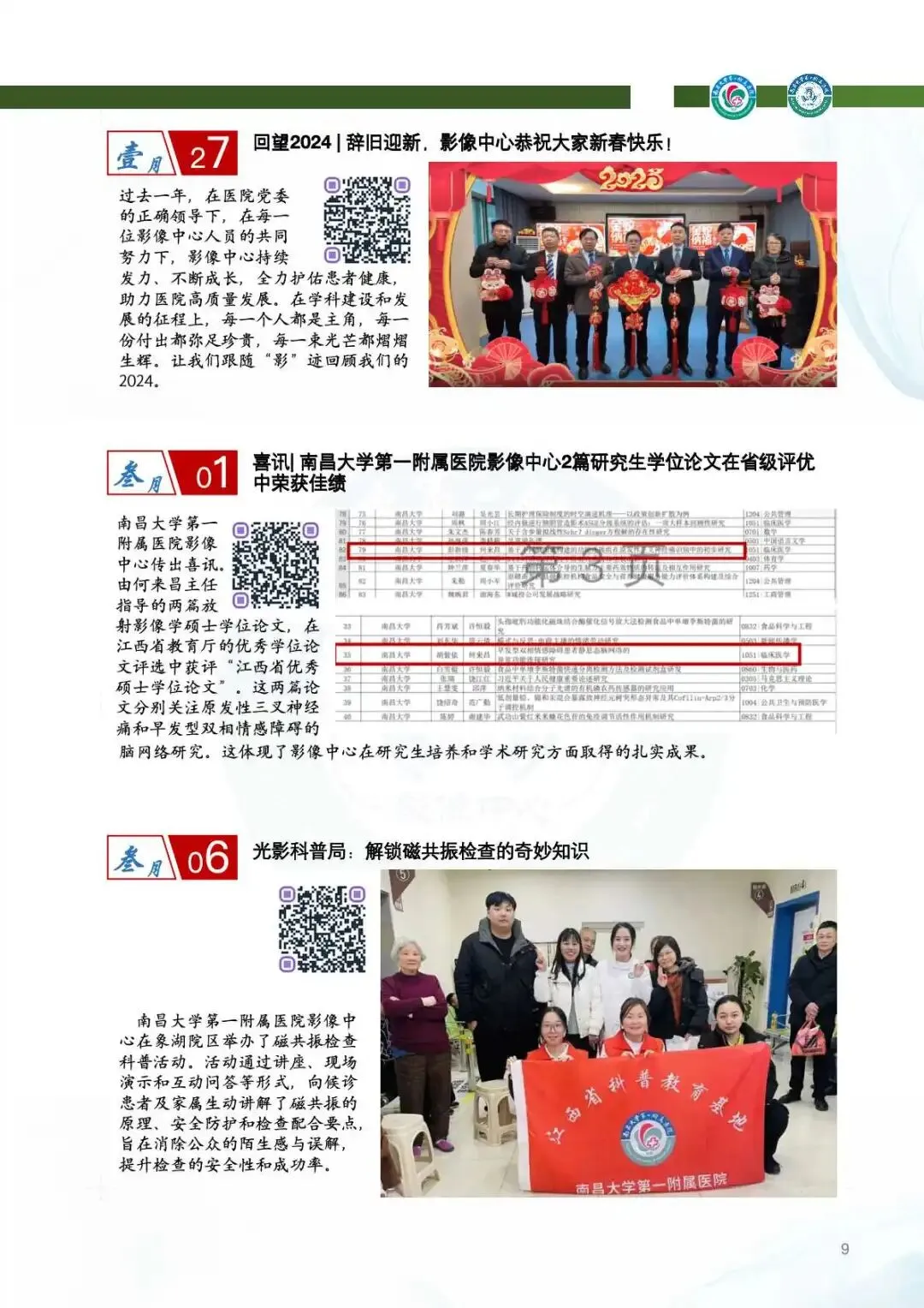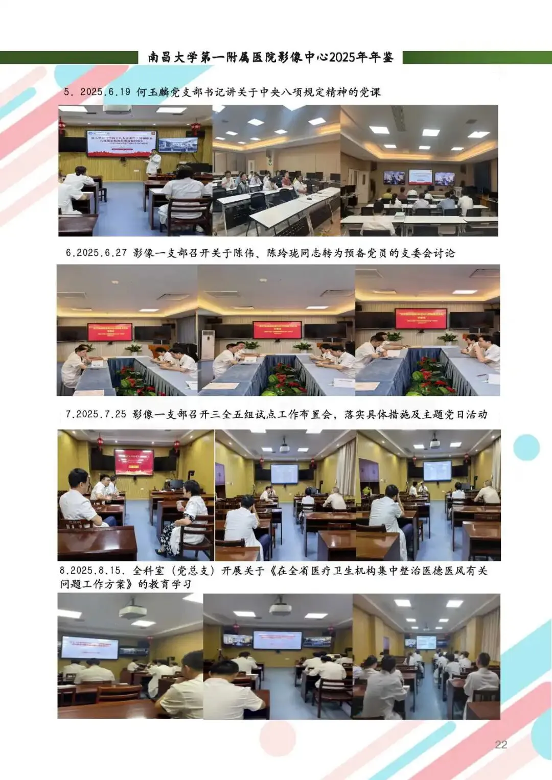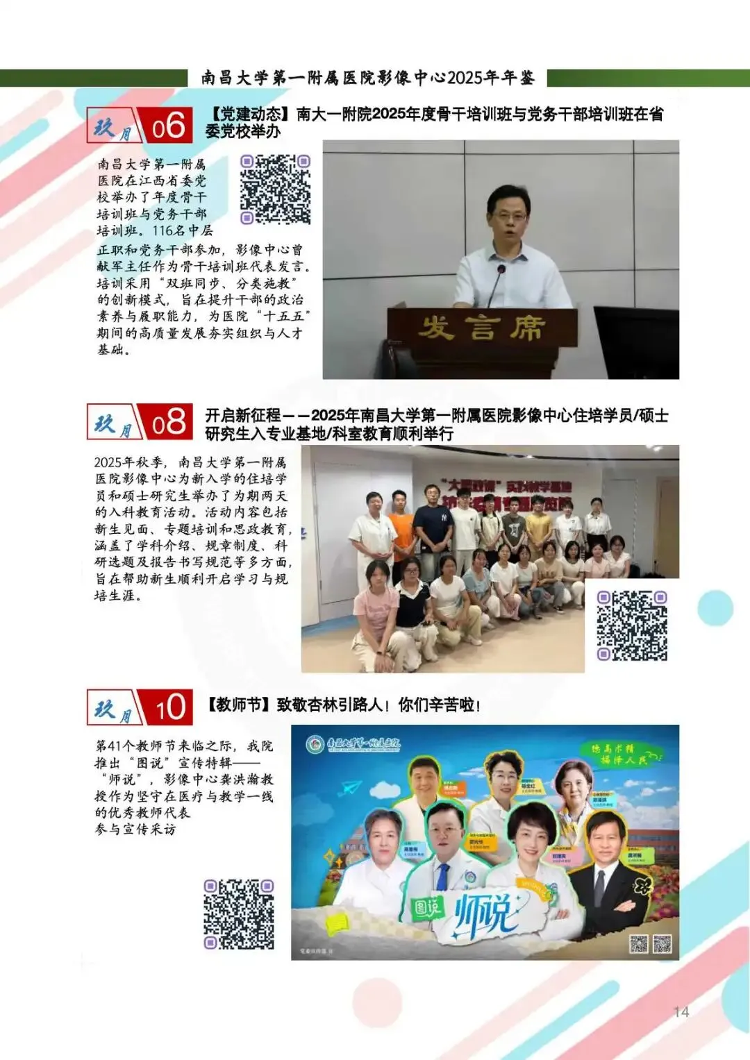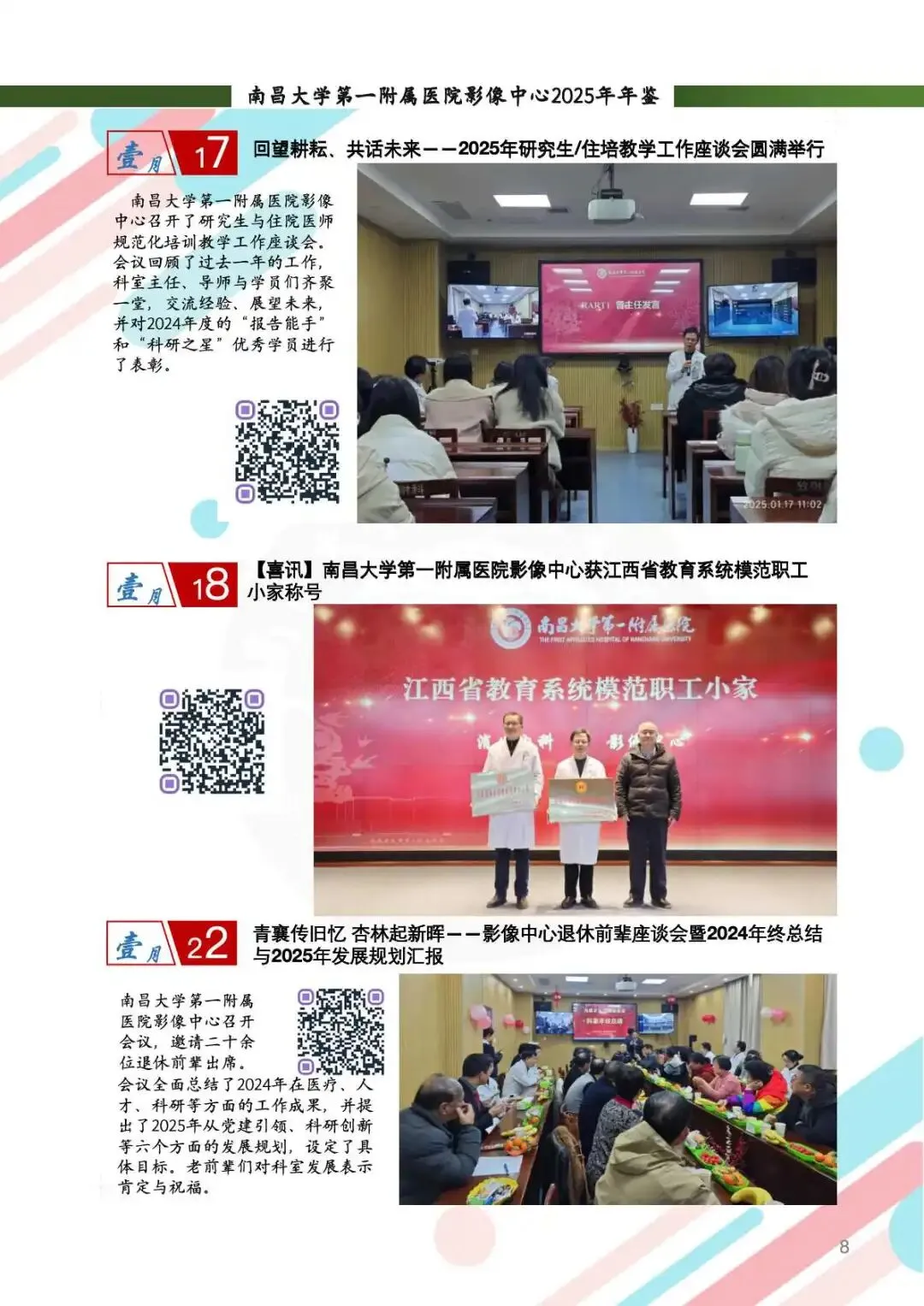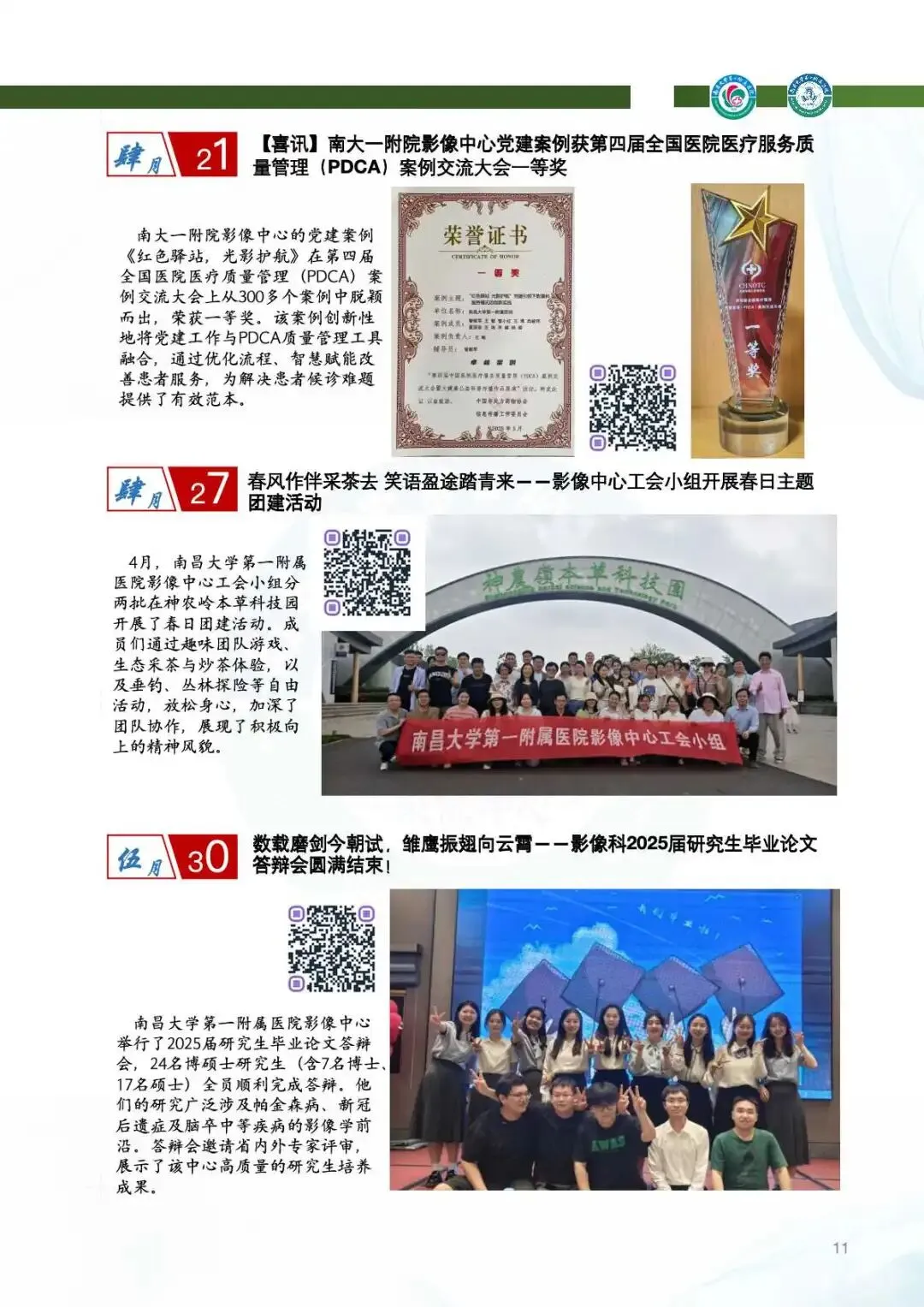 2025年,影像中心党总支以党的二十届四中全会精神为指引,深化党建与业务的融合,筑牢思想根基。通过线上线下常态化学习、警示教育、红色足迹追寻等方式,强化党员政治素养。持续开展“红色驿站,光影护航”等品牌活动,党组织凝聚力显著提升。全年的党建工作获全国医院质量管理一等奖,获评江西省教育系统模范职工小家称号,展现了党建引领下的高质量发展。