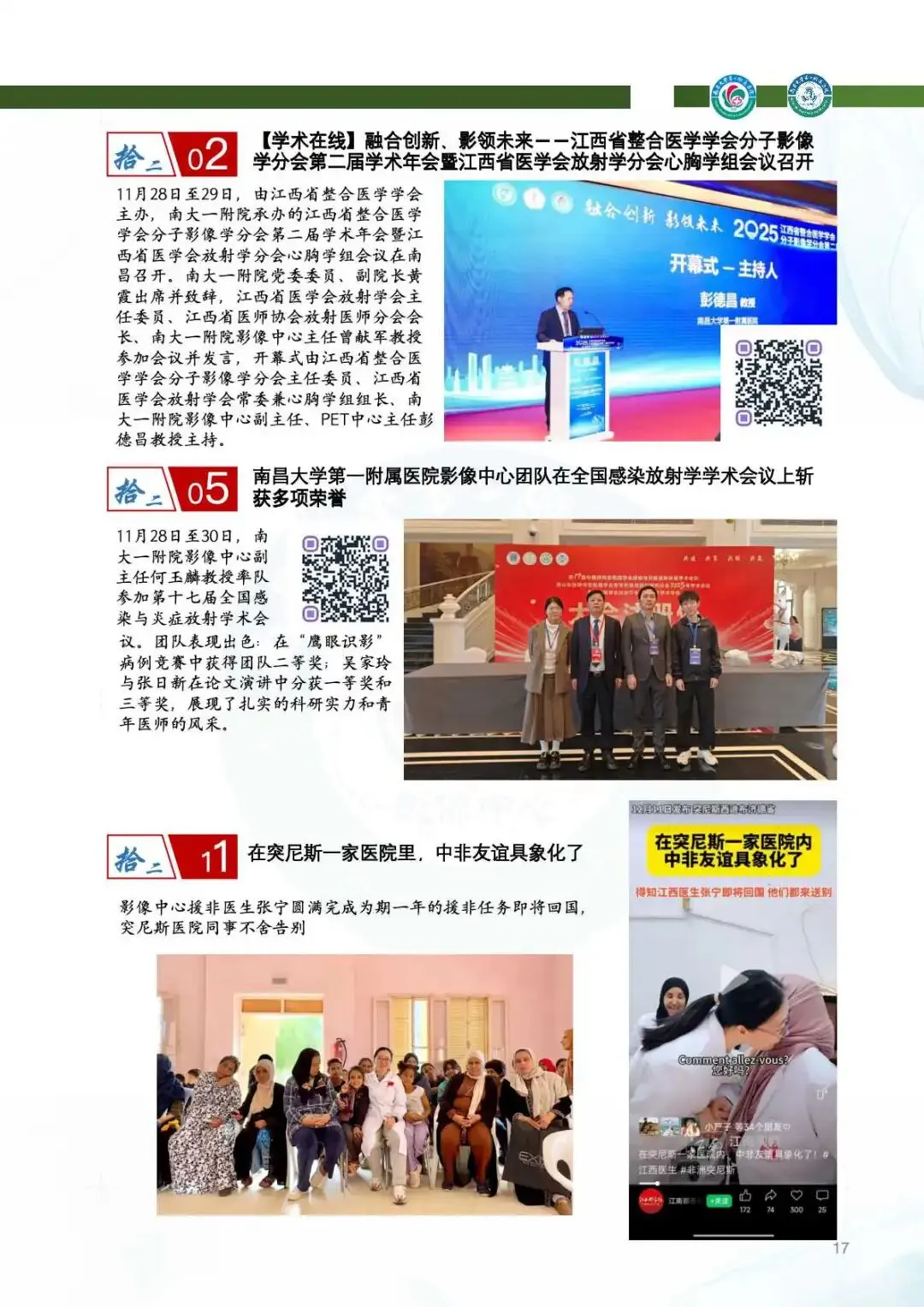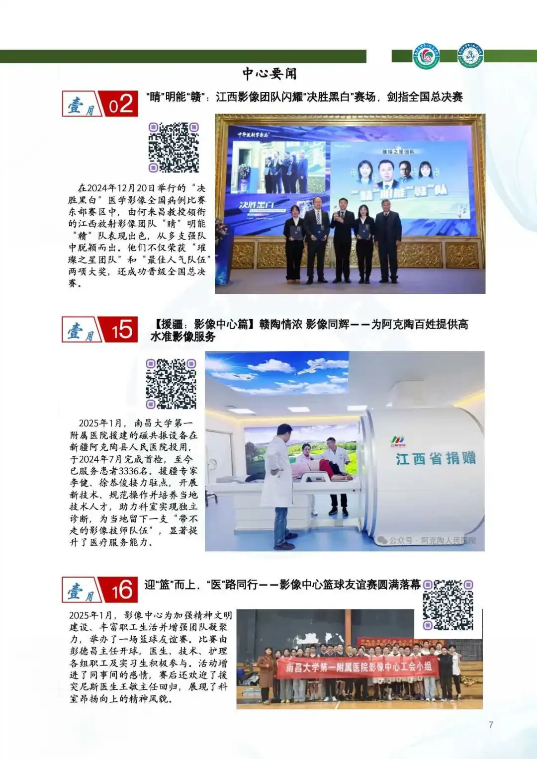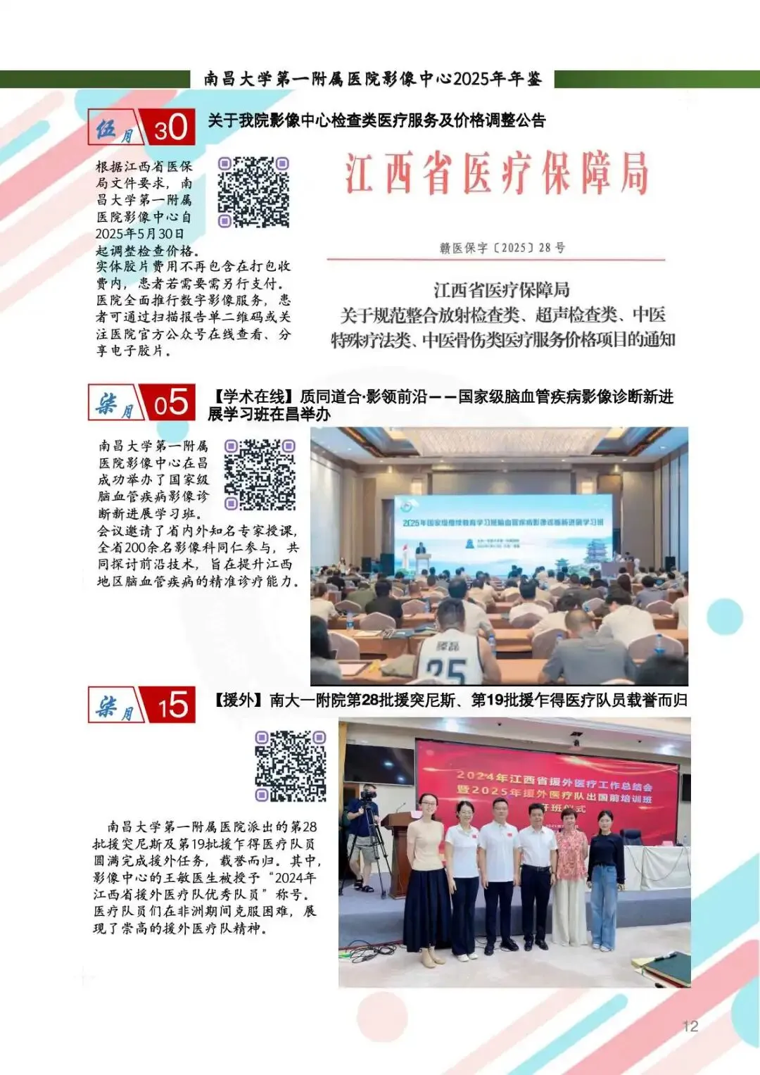 2025年,两院区完成影像学检查服务近43万例次,同比增长4%,其中CT、MRI及介入检查量均稳步提升。援疆医疗队员吴钦医生接力驻点新疆阿克陶县,开展赣陶区域影像中心适宜技术推广学习培训班,培养“带不走的技术队伍”。张宁医生接替援外,医疗队员王敏主任载誉归来,凭借优异表现获“江西省援外医疗队优秀队员”称号。