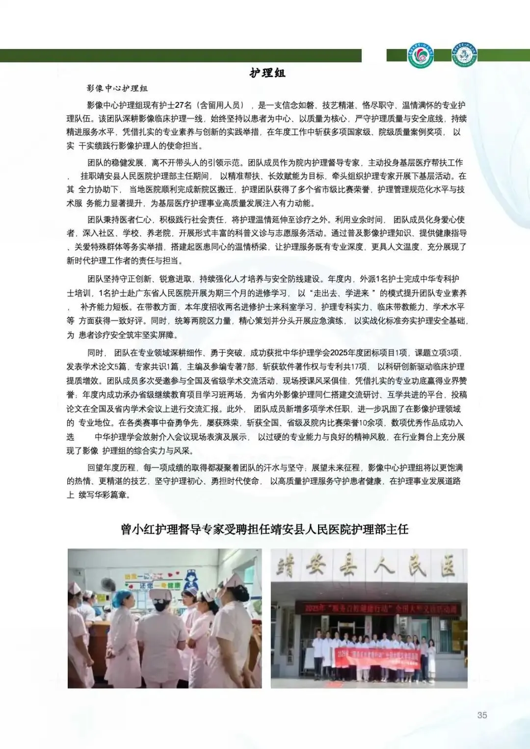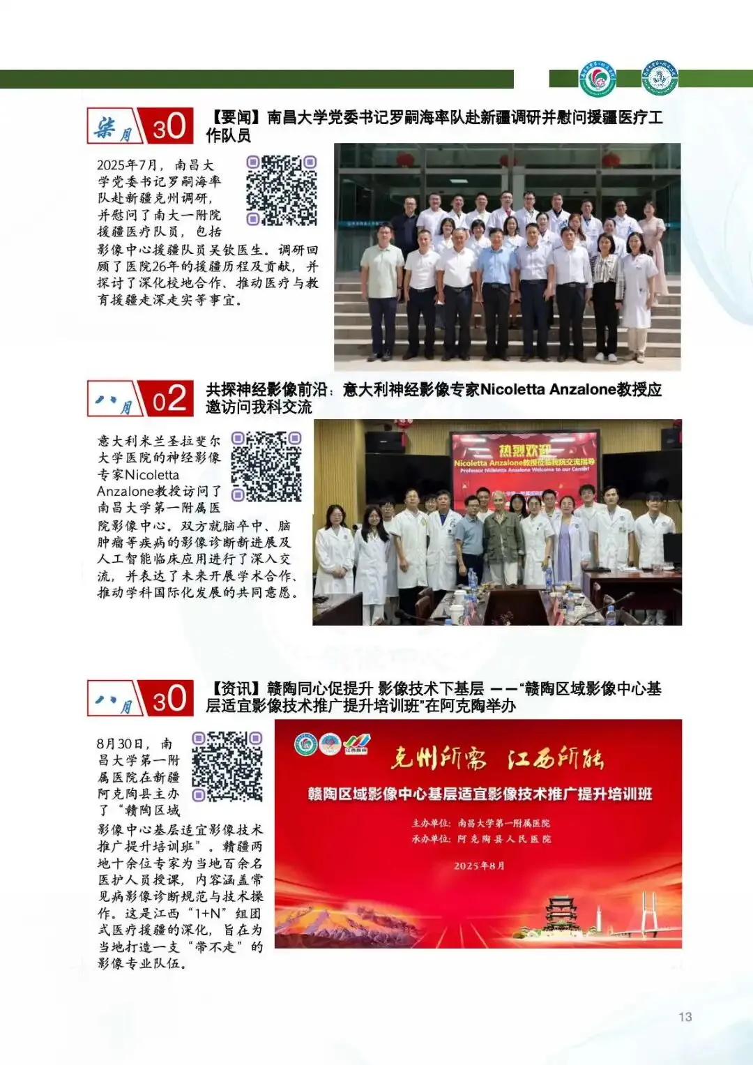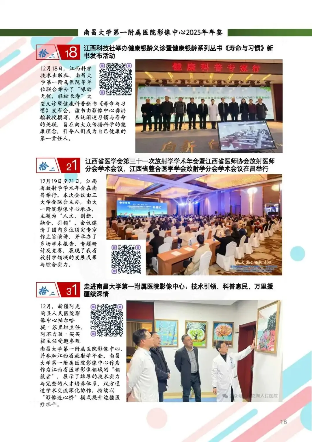 2025年,两院区完成影像学检查服务近43万例次,同比增长4%,其中CT、MRI及介入检查量均稳步提升。援疆医疗队员吴钦医生接力驻点新疆阿克陶县,开展赣陶区域影像中心适宜技术推广学习培训班,培养“带不走的技术队伍”。张宁医生接替援外,医疗队员王敏主任载誉归来,凭借优异表现获“江西省援外医疗队优秀队员”称号。