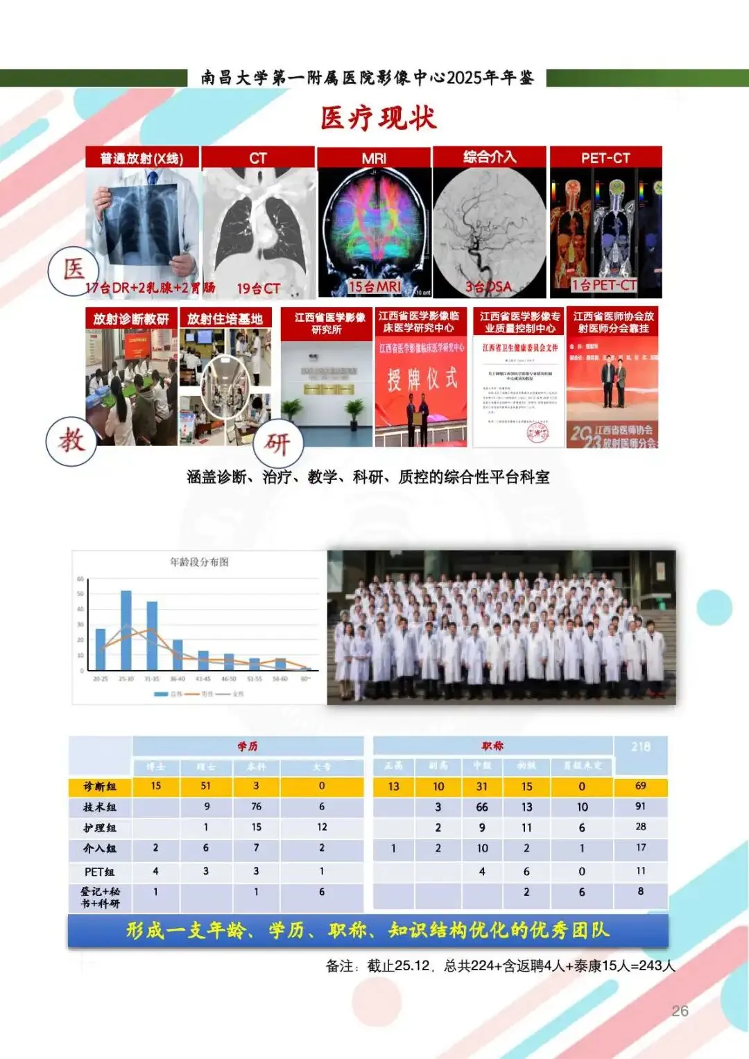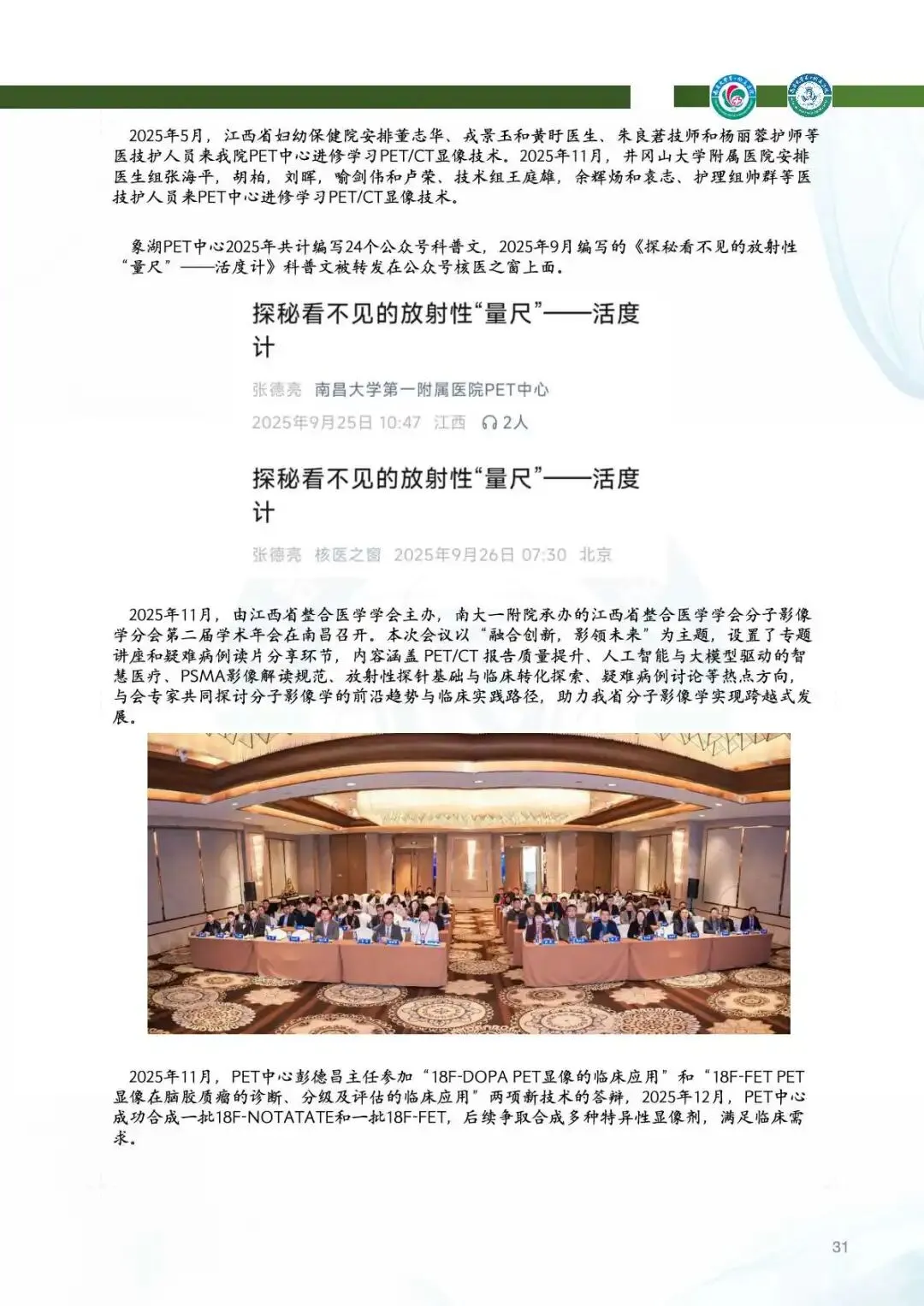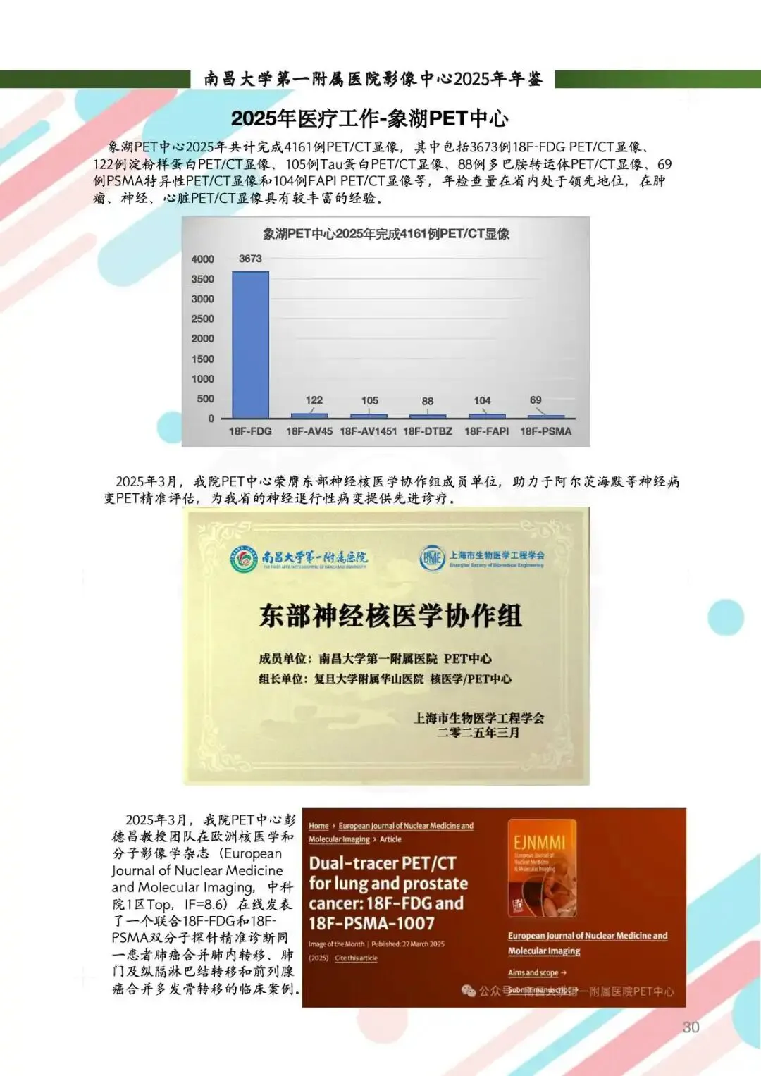 科研产出:新增多项课题,SCI论文发表30余篇,影响因子突破12.4,获批实用新型专利1项、软件著作权14项。PET中心首现18F-FDG、18F-PSMA双分子探针联合诊断方案,创新神经与肿瘤影像研究。科研团队连续受邀参与全国学术会议,成果惠及区域医疗发展。