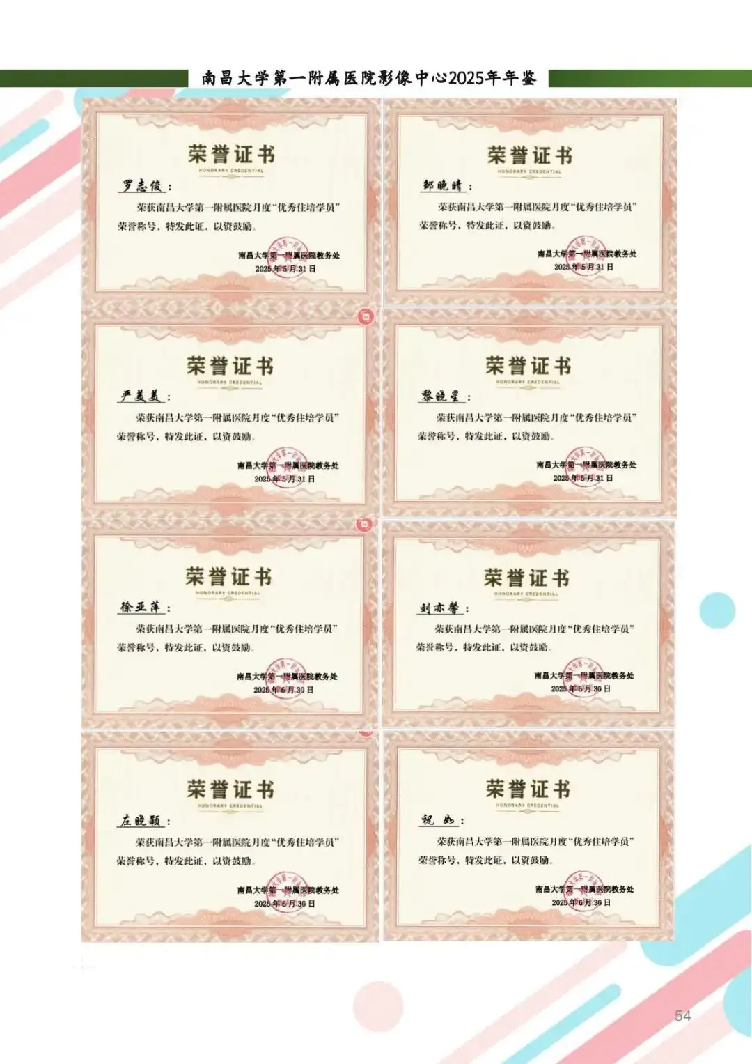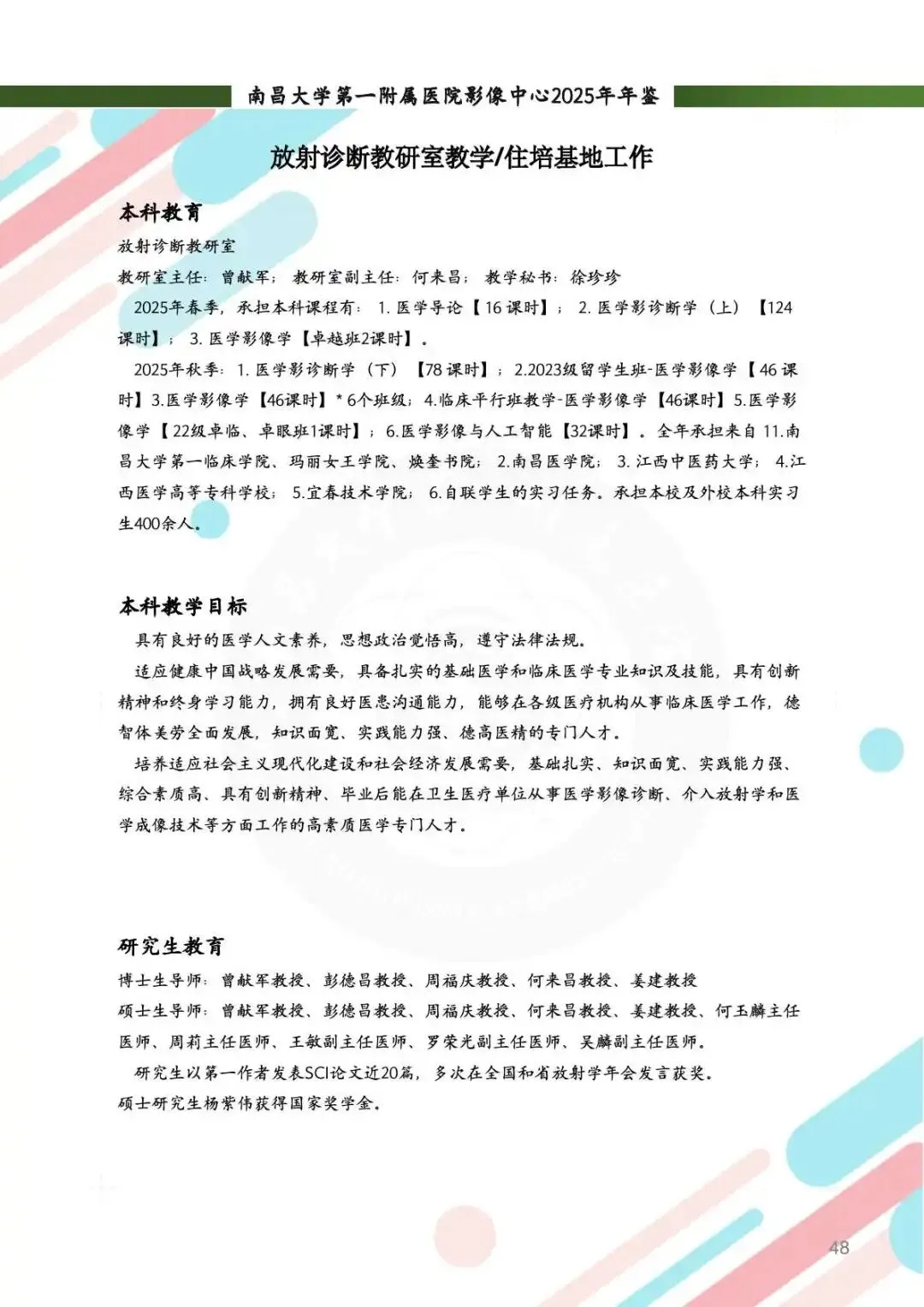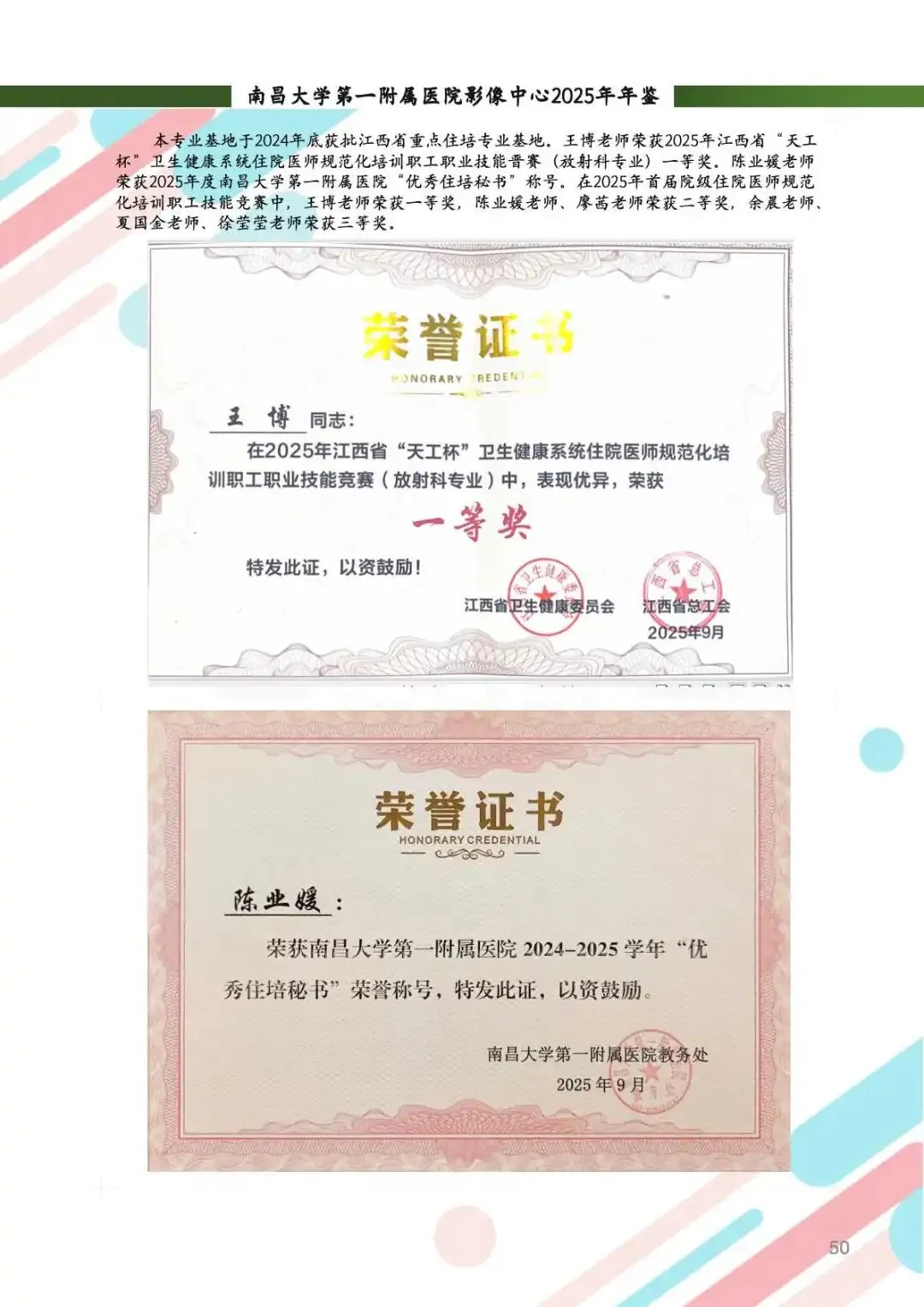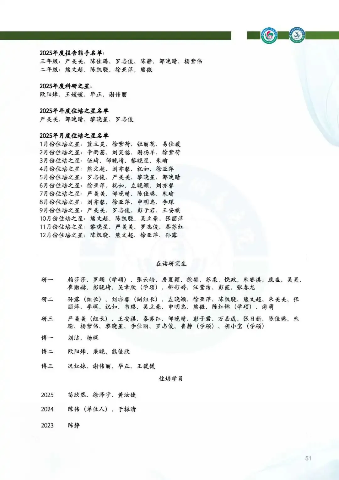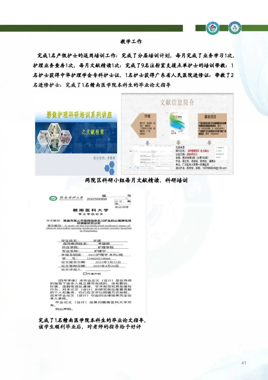 教学工作:举办研究生/住培教学座谈会,表彰“报告能手”与“科研之星”,全年培养博硕士24名,执业医师首考和住培学员执业考试通过率均达100%。新增省级重点住培基地,王博医生获“天工杯”一等奖。团队参加各级住培技能赛屡屡获奖,教学成果硕果累累。