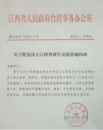 近日,从江西省台办《关于批复设立江西省对台交流基地的函》获悉,我校被批准设立“江西省对台交流基地”。