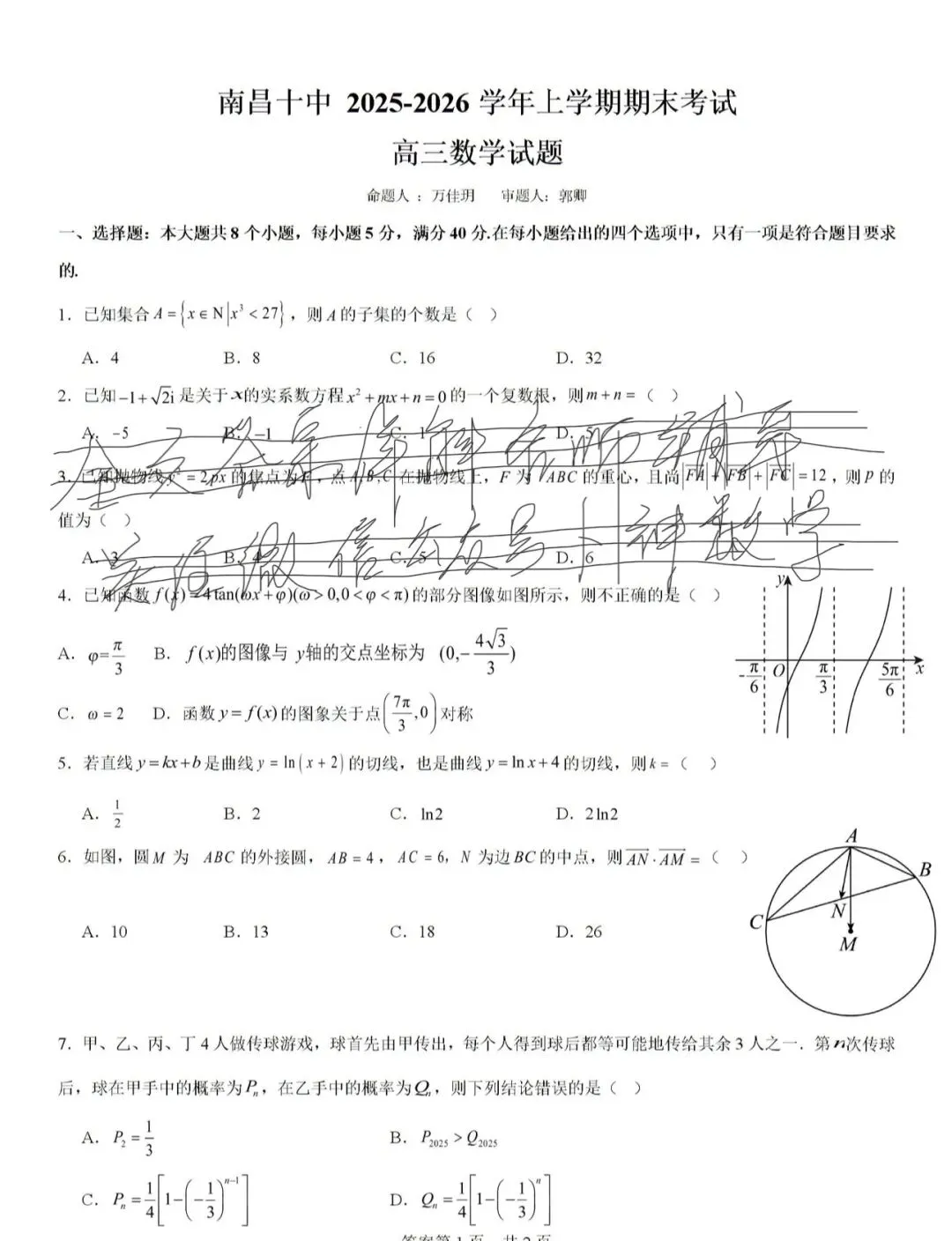 江西南昌市第十中学2025-2026学年上学期期末考试高三数学试题