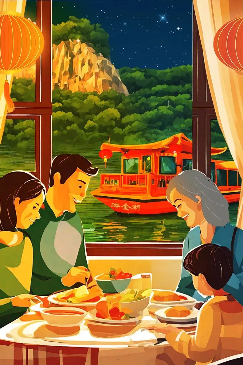 吃年夜饭:除夕最重要的习俗之一,家庭团聚共叙天伦,年夜饭菜肴丰盛,一般少不了火锅和鱼,“鱼”和“余”谐音,象征“吉庆有余”,也喻示“年年有余”。