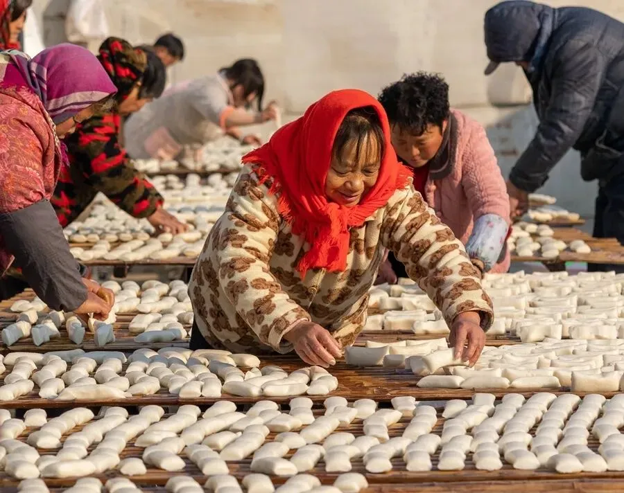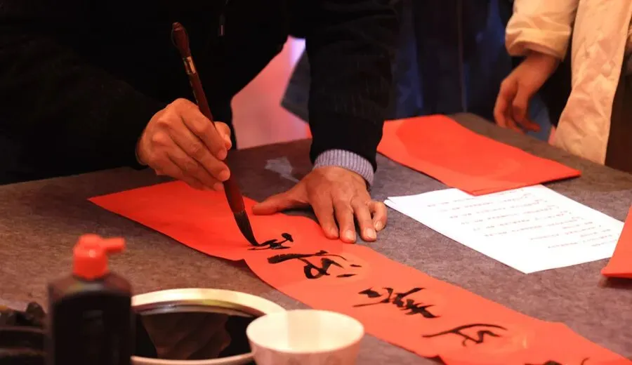 贴年红:包括贴春联、贴窗花、贴福字等。春联以工整、对偶、简洁的文字描绘美好愿望;窗花以剪纸艺术装饰窗户;福字寄托对幸福生活的向往,有的地方会倒贴福字,表示“幸福已到”、福气已倒(到)”。