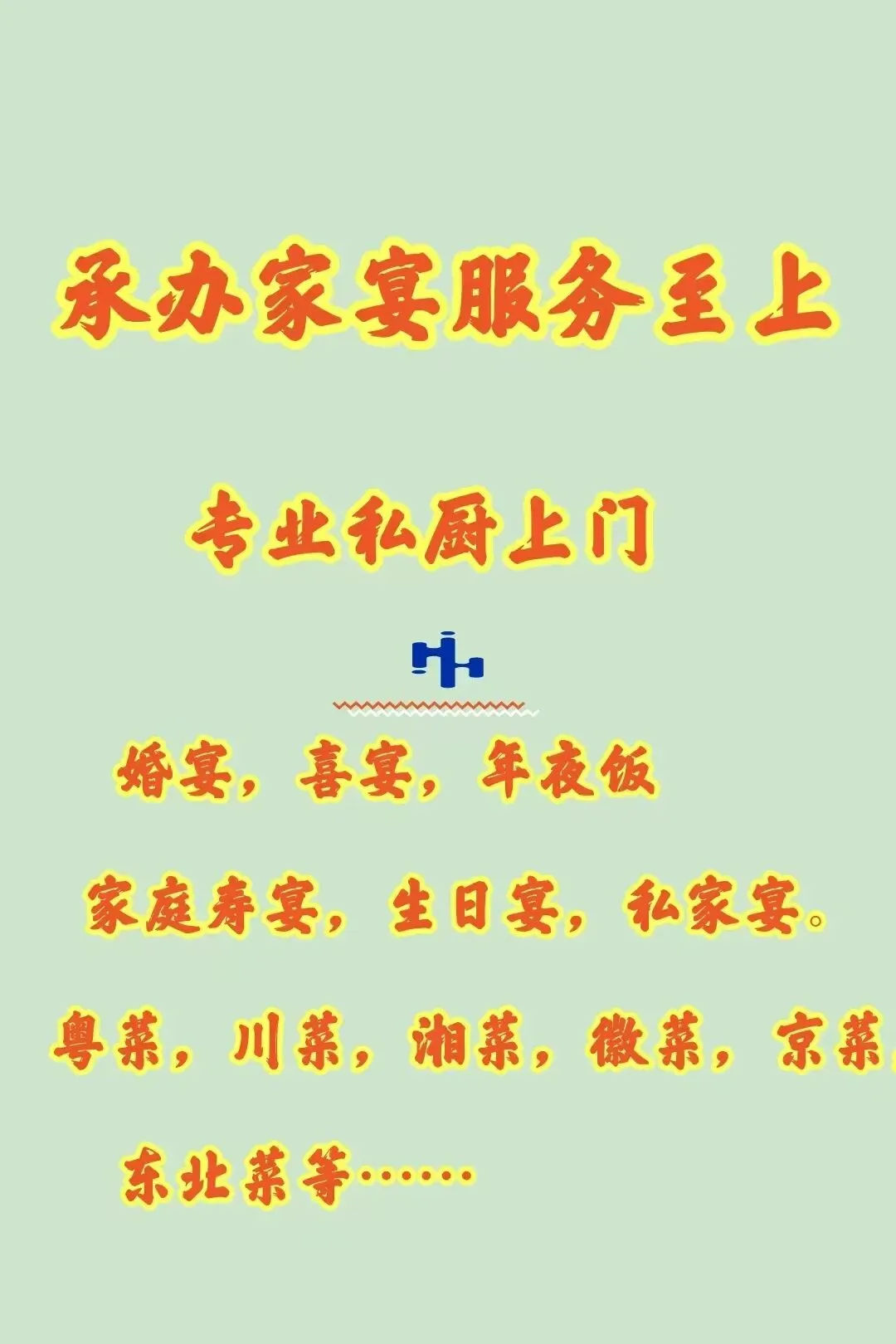 承接各类宴席,包括年夜饭、私家宴、婚宴、家宴、喜宴,以及会所、别墅区商务宴等……所有菜品应有尽有,提供一对一上门定制洽谈!