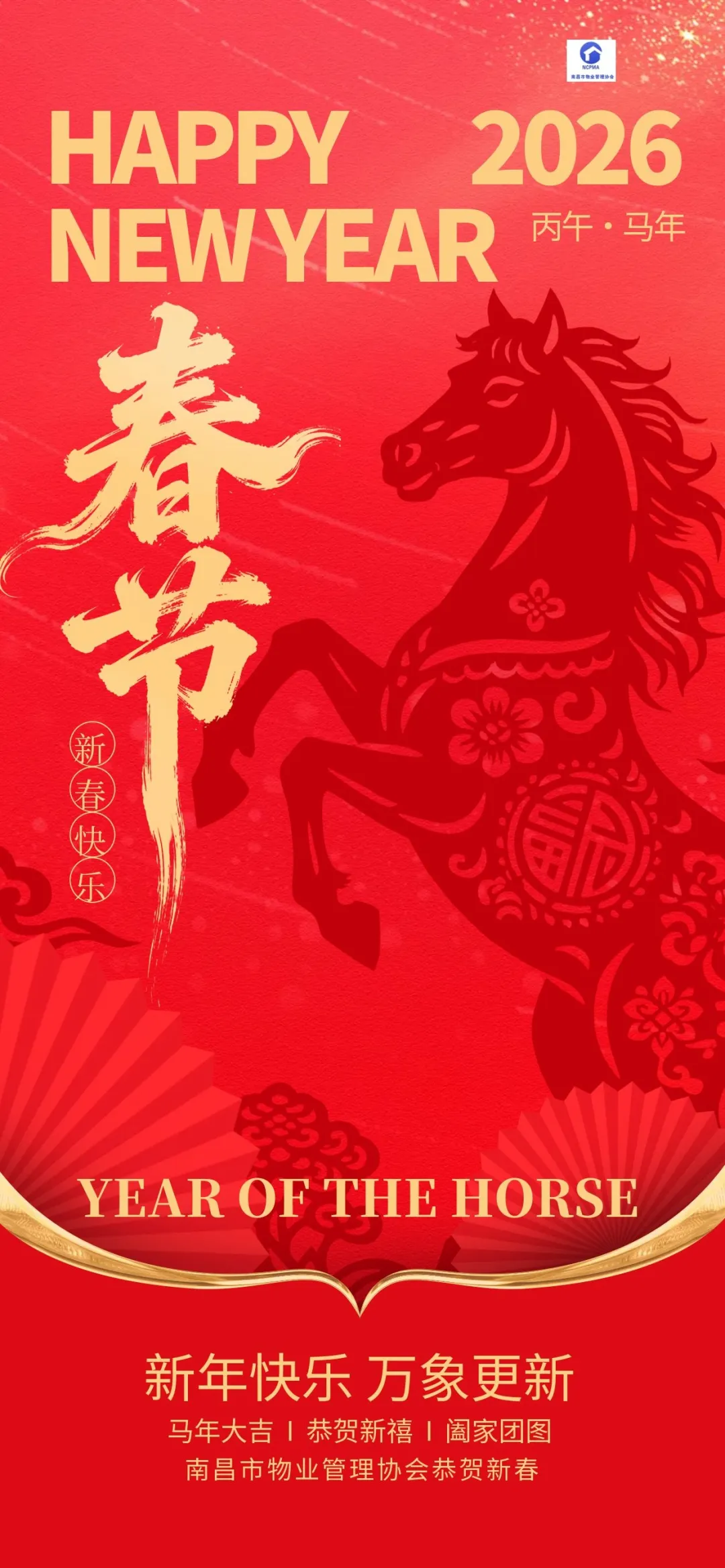 马到成功,吉祥盈门。值此甲午马年新春佳节来临之际,南昌市物业管理协会谨向全体会员单位、物业行业广大从业人员,以及长期关心、支持协会工作和行业发展的各级领导、各界朋友,致以最诚挚的节日问候和最美好的新春祝福!