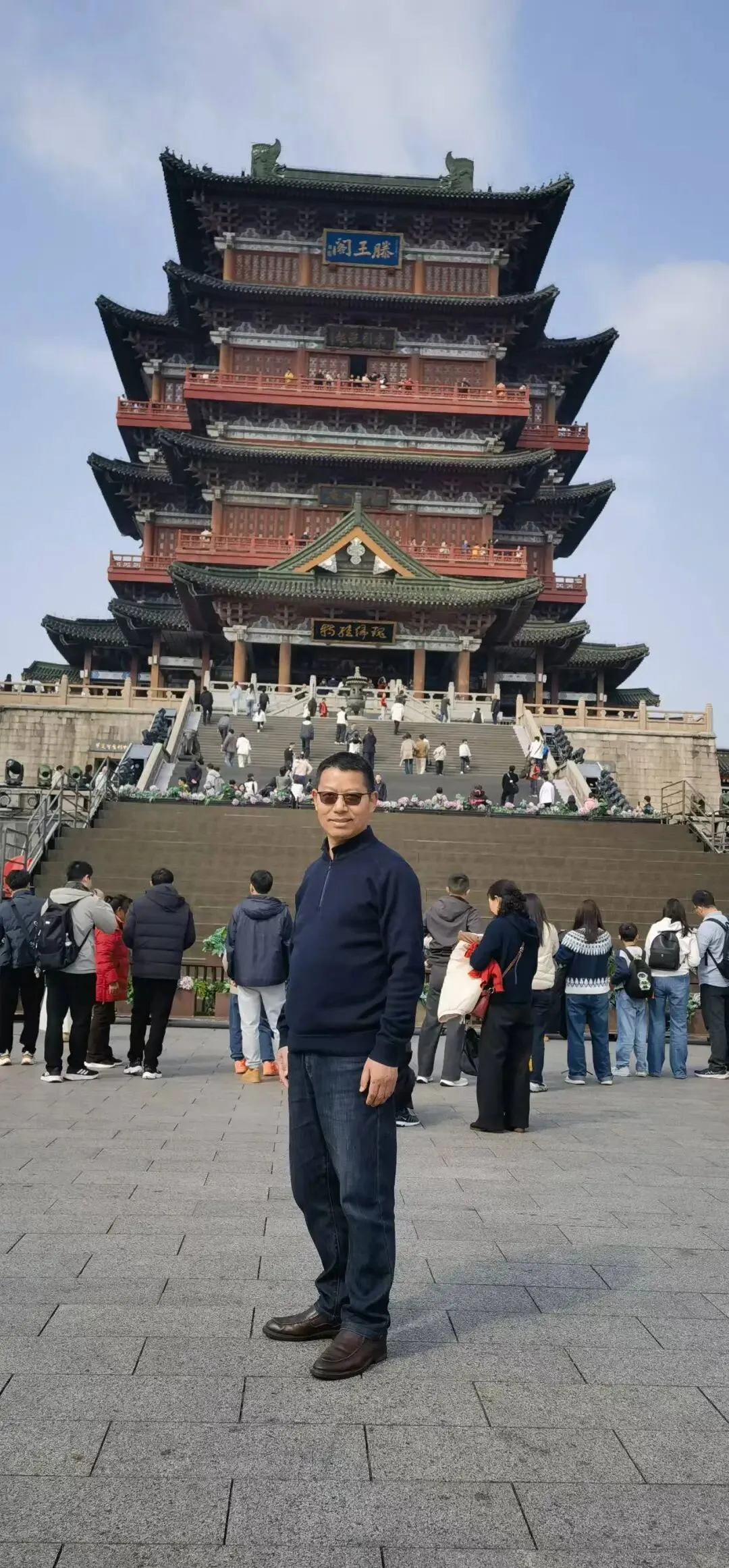 “老板好,请帮我们全家拍个照片,要有滕王阁三个字啊!”“兄弟,也请你帮我拍一张,要有滕王阁全貌啊!”抵达滕王阁景区时,已是人山人海。往来游人中,多是年轻父母携孩子探寻文化根脉,亦有不少同我一般的语文教育者,慕名奔赴这场跨越千年的文字之约。滕王阁由唐太宗李世民之弟、李渊第二十二子滕王李元婴始建,历经沧桑,前后28次毁于战乱天灾,如今巍然矗立的楼阁,为1985年动工、1989年落成的第29次重建之作。
