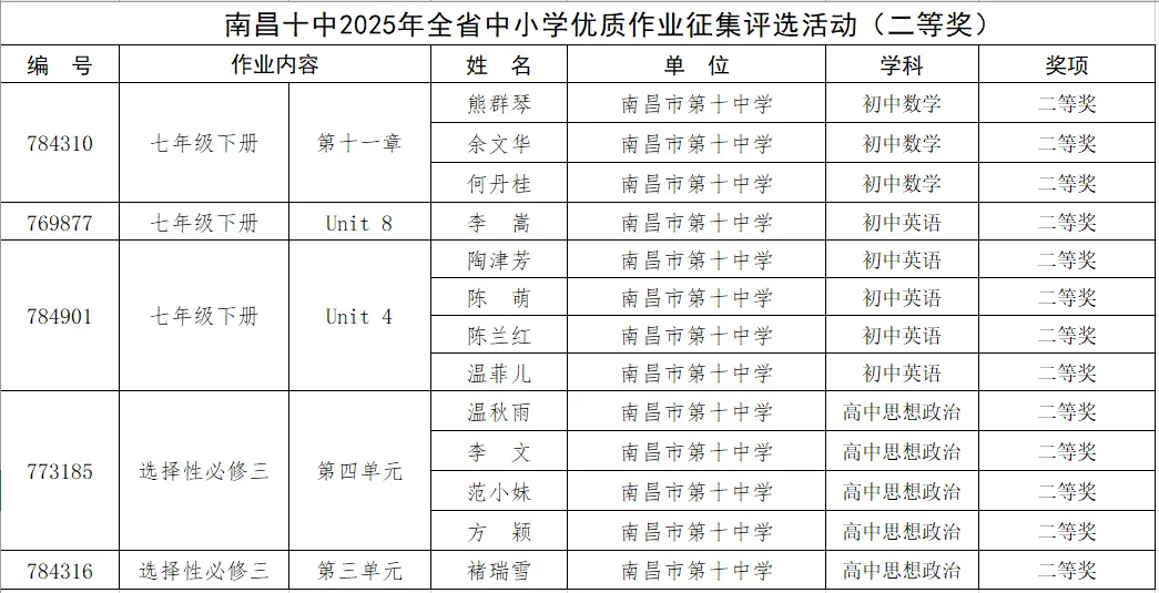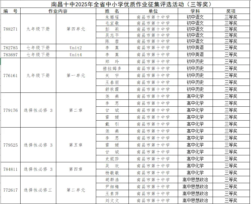 近日,南昌市第十中学在省市两级作业设计评选中喜讯频传、成绩突出。在全省中小学优质作业征集评选活动(第二阶段)中,我校教师共获奖61人次,其中一等奖20人次、二等奖13人次、三等奖28人次;在南昌市普通高中“思享作业”设计大赛中,我校再创佳绩,共获奖87人次,其中一等奖10人次、二等奖36人次、三等奖41人次。两项赛事累计获奖达148人次,充分展现了我校在作业设计与教学研究方面的扎实积累与创新活力。