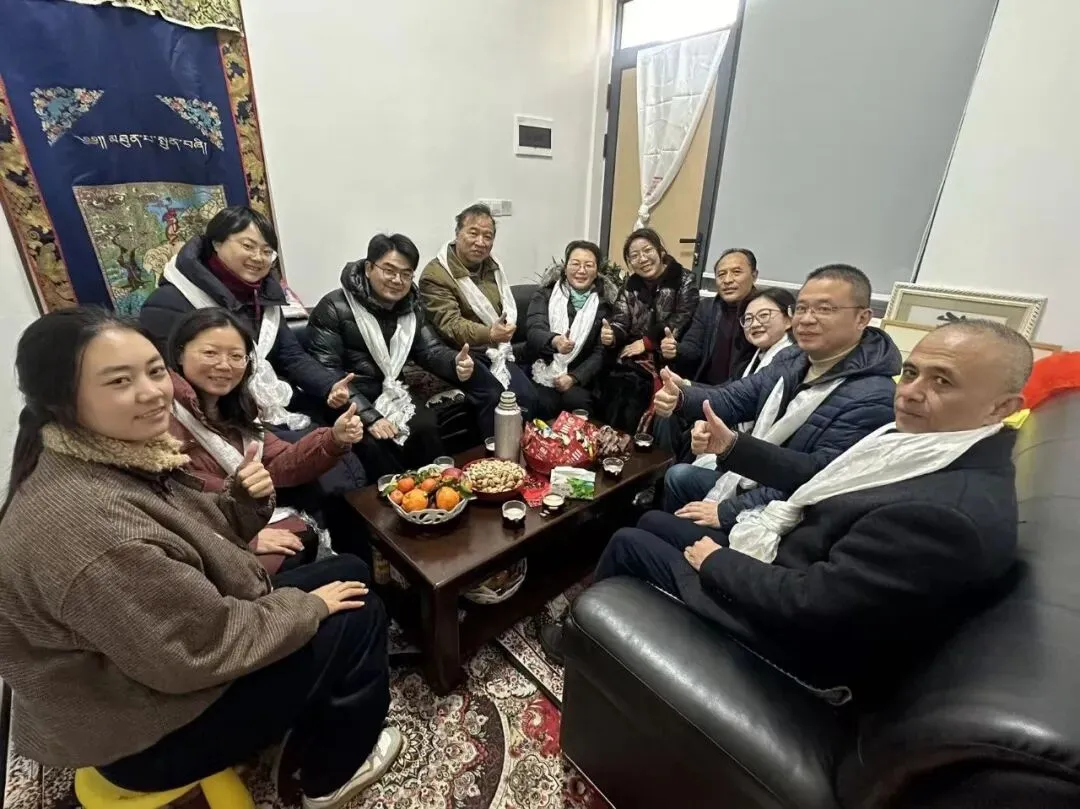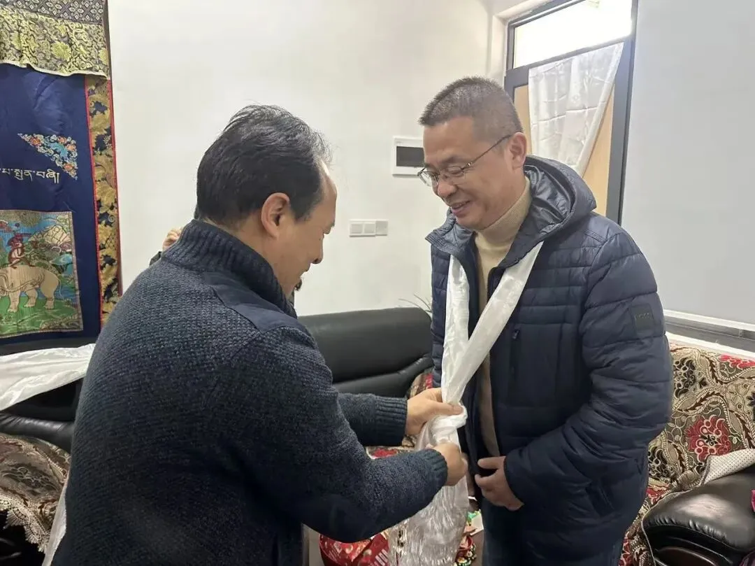 门扉轻启,笑意盈盈。次仁多吉与泽桑卓玛老师早早迎候,热情地将校领导请进家中,并以藏族传统礼仪,为每一位来访者献上洁白的哈达,表达心中最真挚的敬意与欢迎。