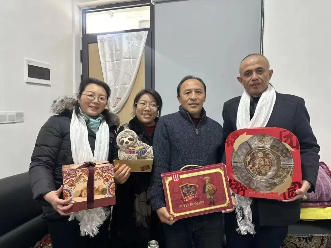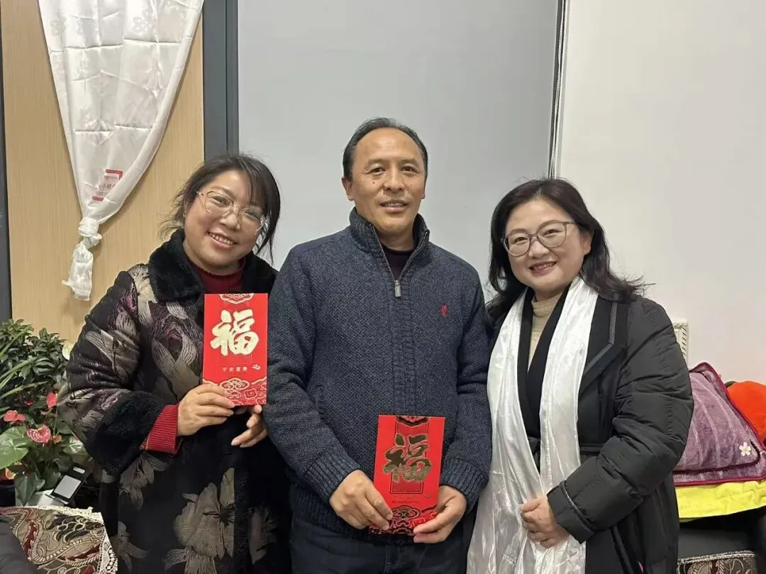 各位校领导代表学校,将满载情谊的新年慰问金和慰问品送到两位老师手中。亲切的问候、温暖的祝福,在笑语盈盈中流淌。大家围坐一堂,闲话家常,交流生活细节和工作近况,温馨的屋子里洋溢着浓浓的年味与深深的情谊。