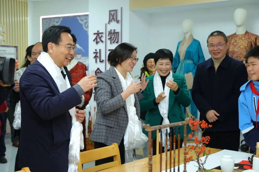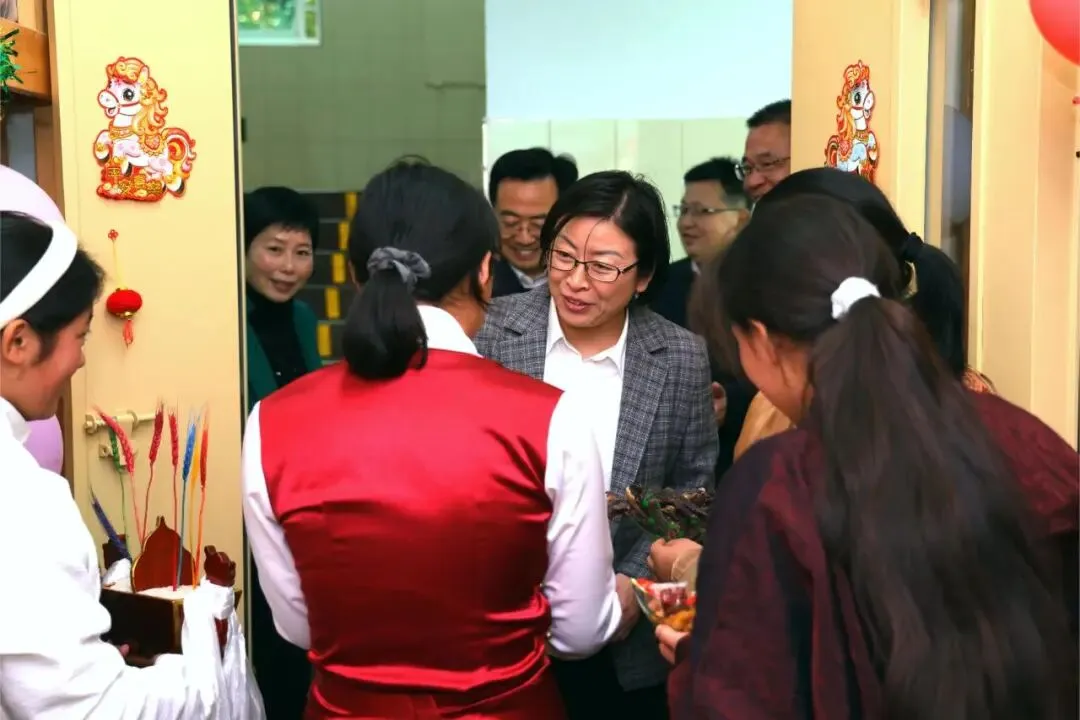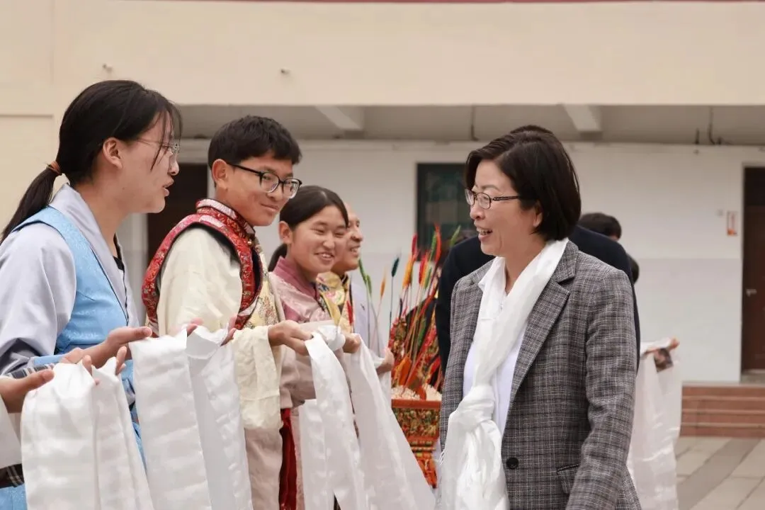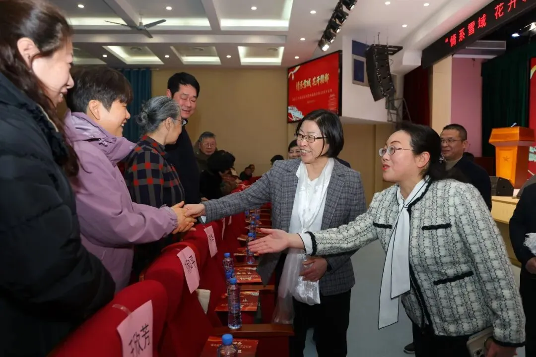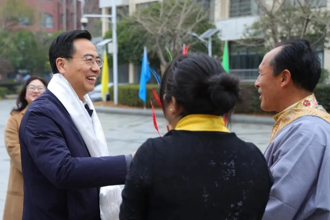 参观结束后,领导们步入修远楼三楼大礼堂。庆典开始前,党静一行与西藏班历任教师代表亲切握手、互致问候。一代代教育工作者数十载扎根民族教育沃土,此刻的握手既是温暖的致意,更是精神的接力。