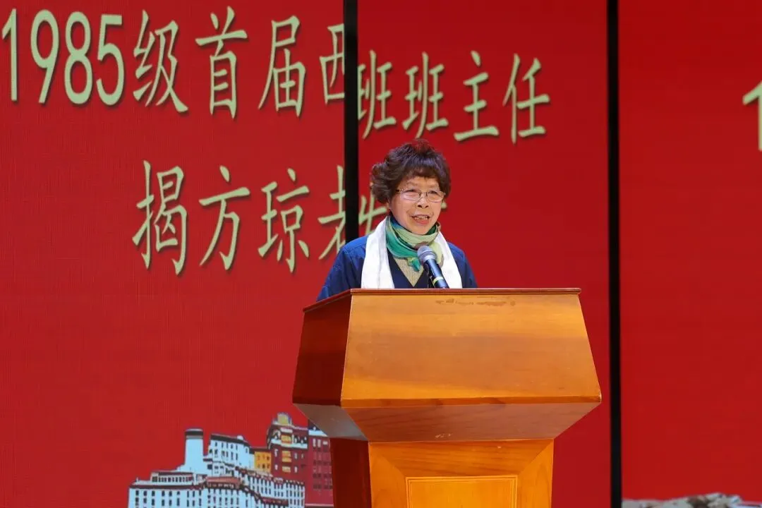 1985级首届西藏班班主任揭芳琼老师作为教师代表上台发言,回首四十年办班初心,深情讲述自己与西藏学子朝夕相伴的动人故事,诠释对民族教育事业的赤诚与热爱。