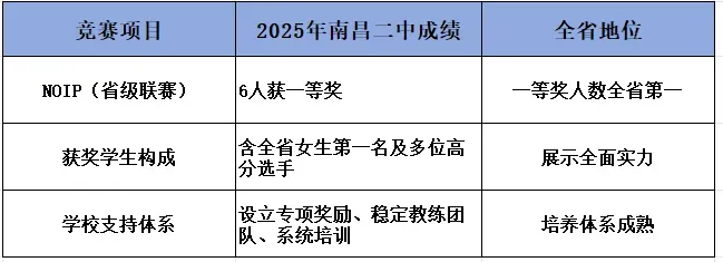 南昌二中构建了完善的竞赛培训体系,拥有稳定的教练团队,在拔尖创新人才培养方面积极探索,2025年,学校专门设立“学科竞赛优秀学生”奖励,对在五大学科奥林匹克竞赛中获得优异成绩的学生给予表彰和鼓励。