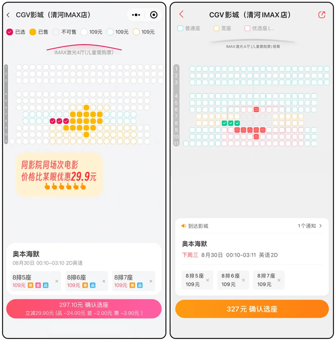 对比下同场次的电影票价格