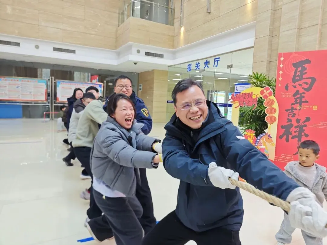 走进海关大楼,扑面而来的是喜庆的中国红。灯笼挂起来,春联贴起来,窗户上还趴着可可爱爱的福气小马。