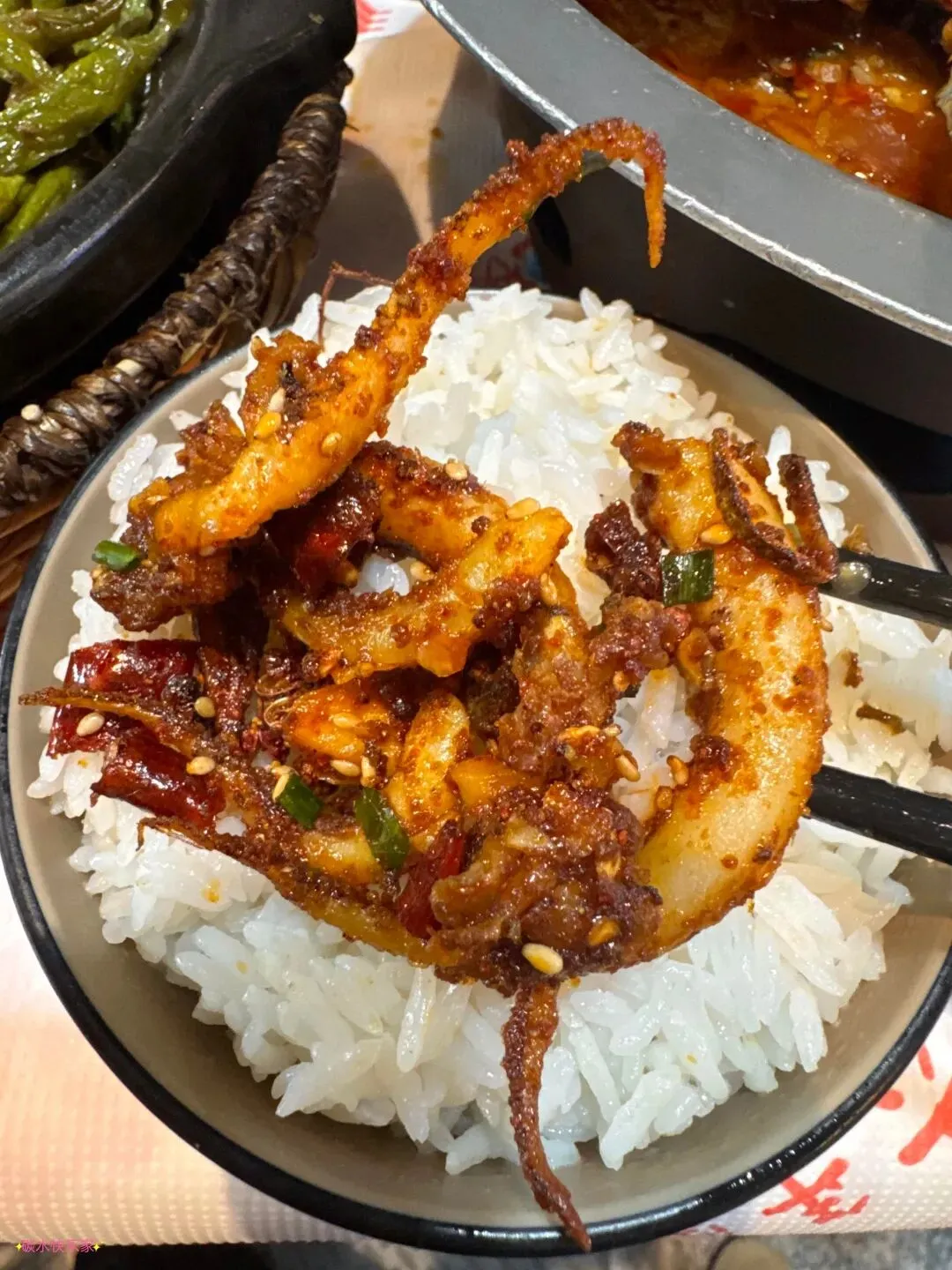 • 铁板鱿鱼须:鱿鱼须Q弹有嚼劲,在铁板上烤得滋滋冒油,搭配上特制的酱料,香气四溢。一口鱿鱼须,一口米饭,幸福感直接拉满!