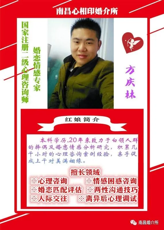 我是方老师,我在南昌心相印婚介等着你,如果你想征婚相亲、解决更多的情感困惑,请添加我的微信号:18979155882