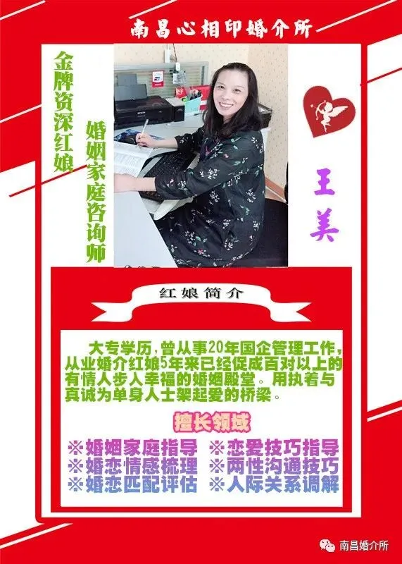 我是王老师,我在南昌心相印婚介等着你,如果你想征婚相亲、解决更多的情感困惑,请添加我的微信号:13387005021
