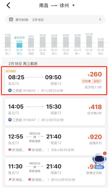 机票价格走势也推动了出游高峰提前。今年初一初二为相对的价格低谷,随着假期时间推移,机票价格渐高。目前,部分热门航线机票价格比火车票便宜。例如,在上述平台搜索发现,2月18日南昌-徐州的机票价格为260元起,而对应的高铁票价为583元起。
