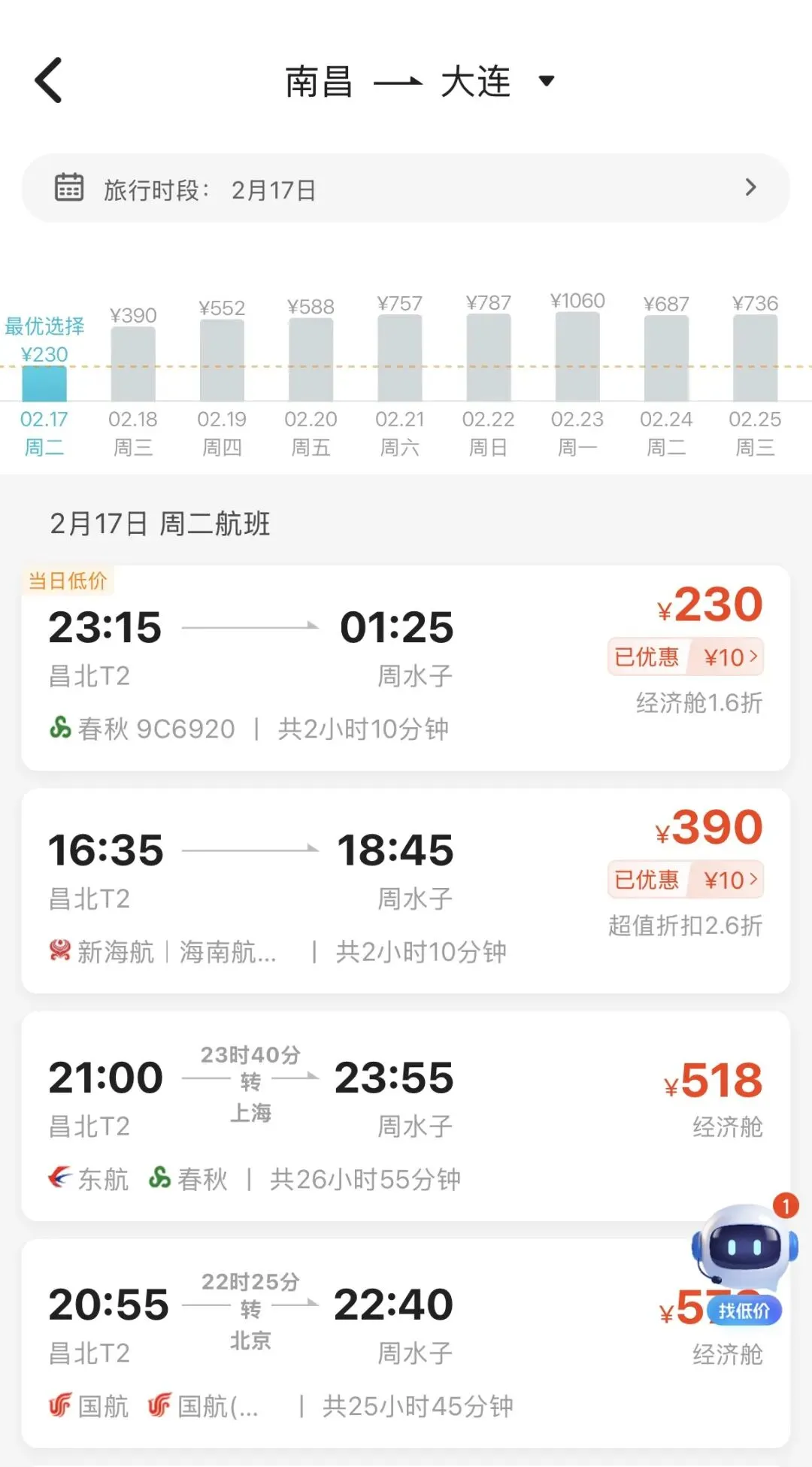 上述平台还有多条航线仍有低价机票在售。如2月18日南昌-温州为280元,2月17日南昌-大连为230元等。