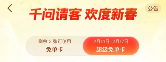 阿里巴巴:“春节大免单”今起再加三天,每人可领 10 张 25 元超级免单卡,还将接入大麦、飞猪,用户可体验 AI 买电影票、门票等新功能