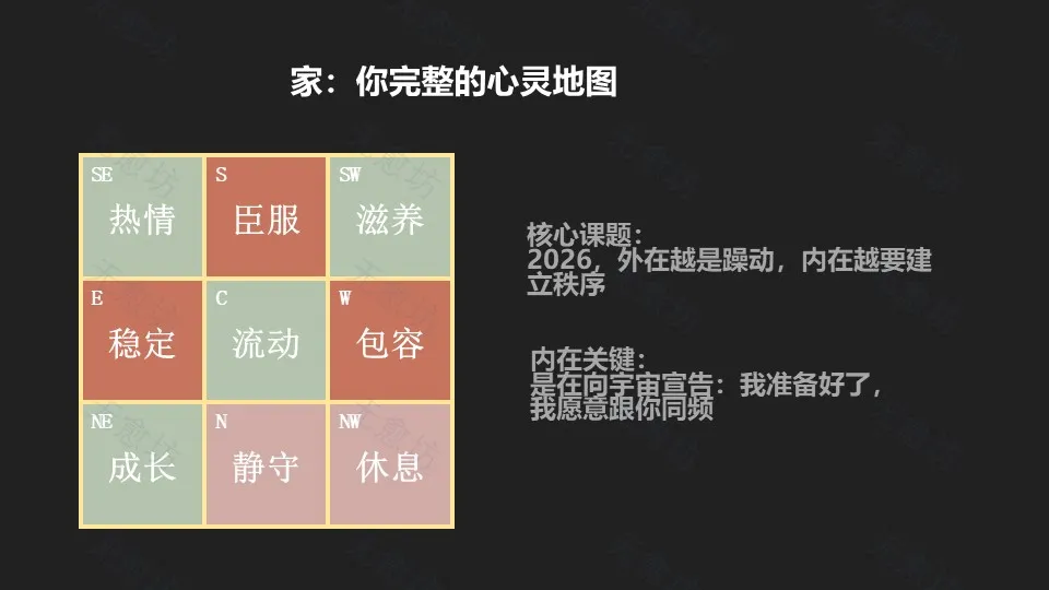 这张图将家的九个方位与九种深层心理状态一一对应:从"东南的热情"到"西北的休息",从"中心的流动"到"东北的成长"。
