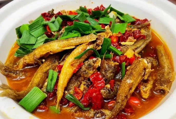 推荐尝尝“棍子鱼”:做法讲究个火候。小鱼处理干净,不用裹面,直接下锅用油煎到两面金黄,皮焦肉嫩。然后下姜蒜爆香,倒进自家腌的红辣椒,加水焖煮。汤汁收浓时,撒把大蒜叶出锅。咬一口,焦香裹着辣味,连骨头都酥了,特下饭。