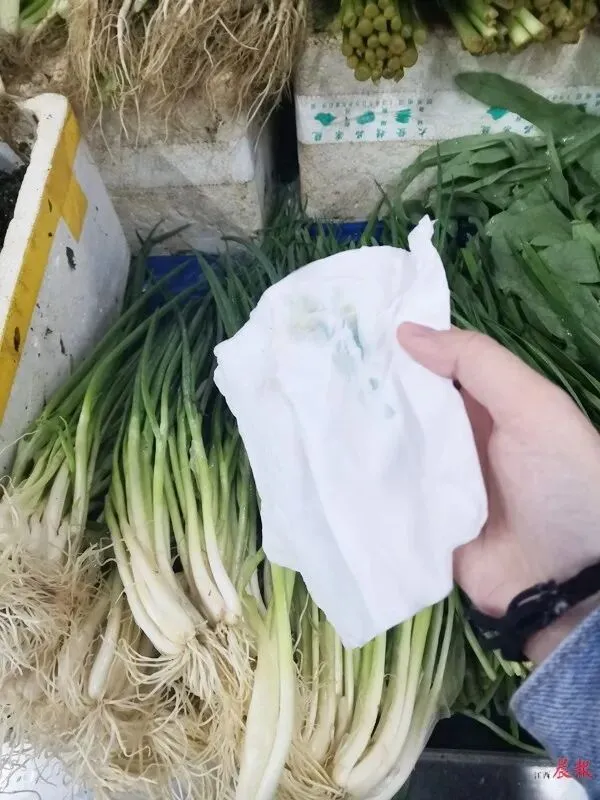 ▲在一家菜摊蔬菜摊位,擦过香葱的纸巾上留下了明显的染色痕迹。记者拿被染色的纸巾询问摊主,摊主表示不清楚为什么香葱会掉色,进货后便把香葱摆放售卖,一直没有注意过有这类掉色的情况。随后,记者又挑选几家蔬菜摊位擦拭香葱发现,一家摊位上售卖的香葱出现了“掉色”,也有部分摊位上的香葱只擦拭出了粘在葱上的泥土,并未出现纸巾染色的情况。“我们会对农贸市场进行检查,查看蔬菜摊上的香葱‘掉色’问题,并根据实际情况来实施具体整改方案。”该分局王姓负责人称。