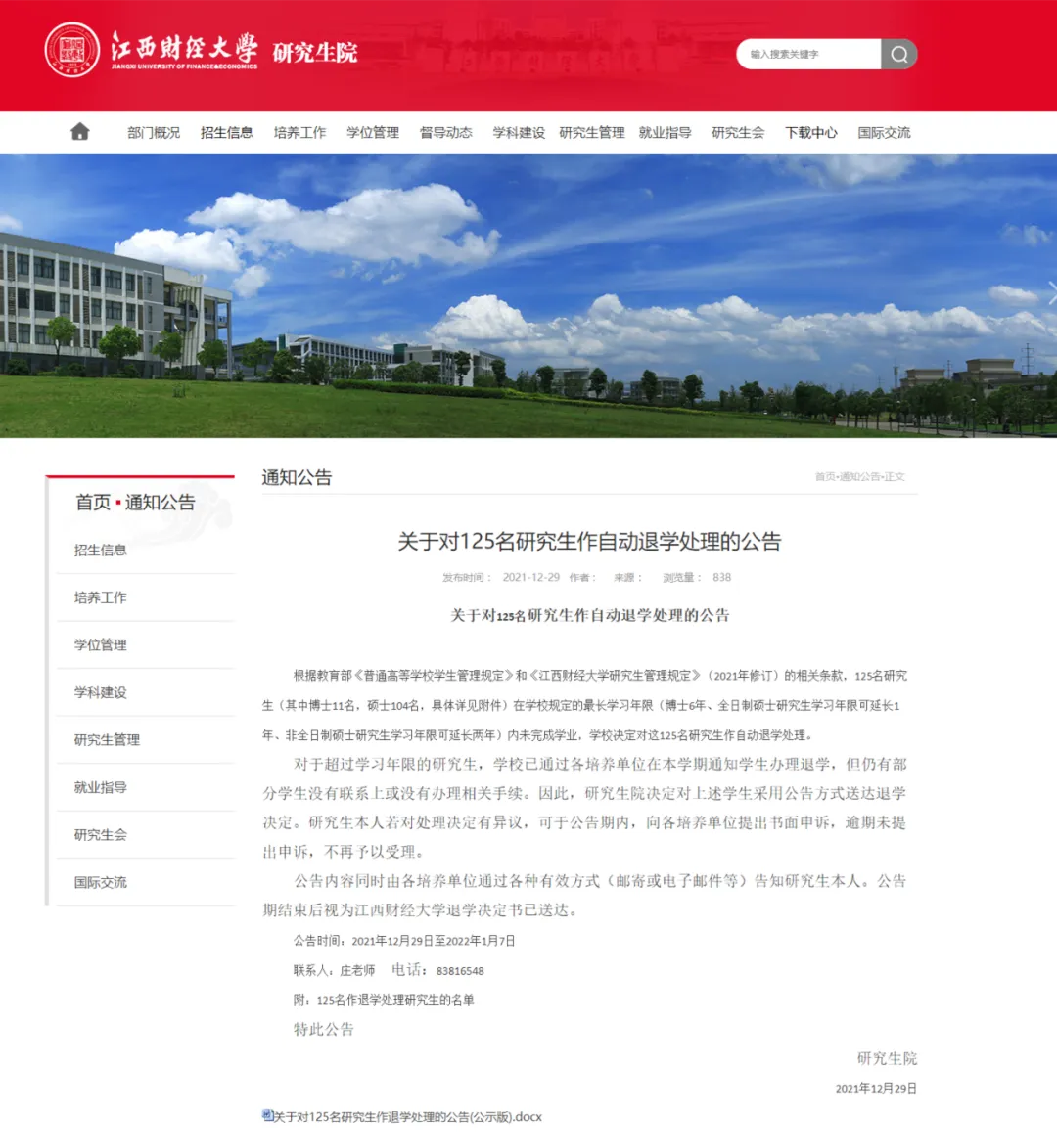 根据教育部《普通高等学校学生管理规定》和《江西财经大学研究生管理规定》(2021年修订)的相关条款,125名研究生在学校规定的最长学习年限(博士6年、全日制硕士研究生学习年限可延长1年、非全日制硕士研究生学习年限可延长两年)内未完成学业,学校决定对这125名研究生作自动退学处理。