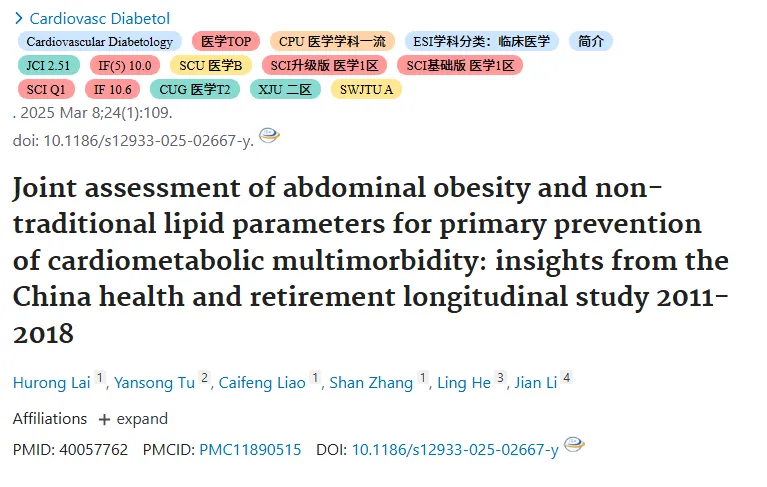 ❗南昌大学第二附属医院团队在《Cardiovascular Diabetology》发表研究,依托中国健康与退休纵向研究(CHARLS)2011-2018 年数据,通过 Cox 比例风险模型、中介分析等方法,解析二者协同致病机制,明确腹型肥胖介导血清脂质代谢异常的核心通路,为中老年人心代谢多重发病初级预防提供精准依据。