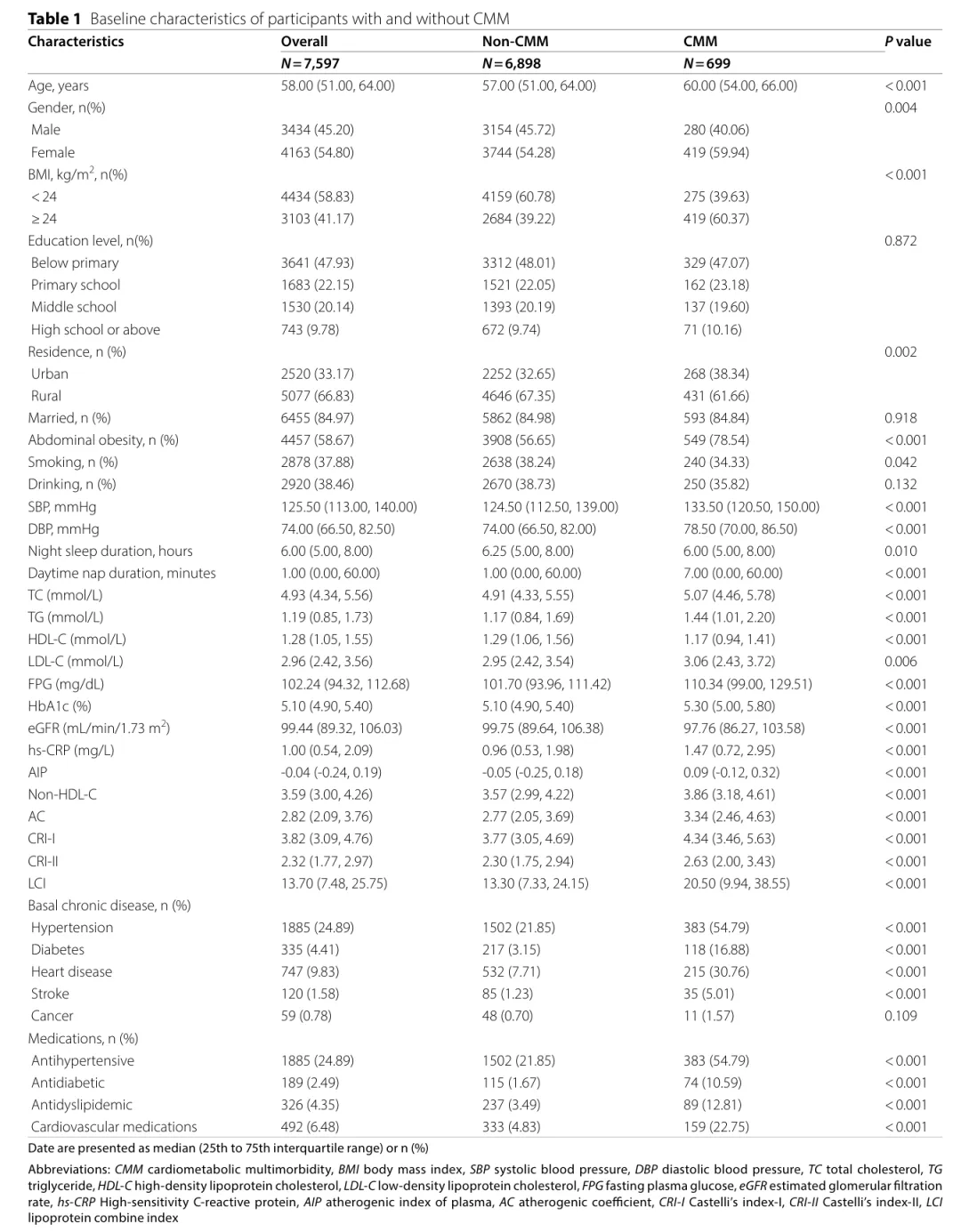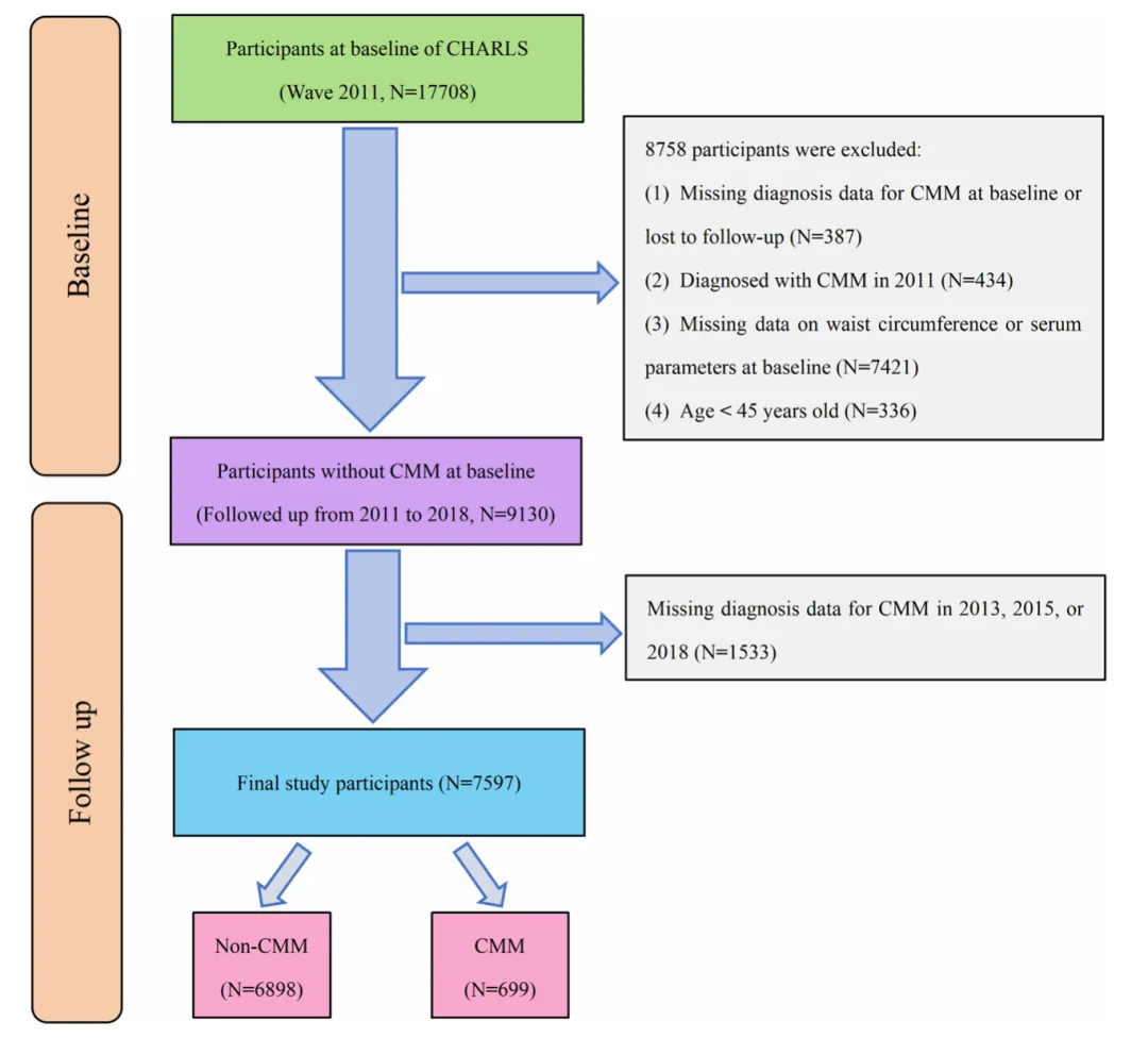 依托中国健康与退休纵向研究(CHARLS)2011-2018 年数据,纳入 7597 名 45 岁及以上符合标准的参与者,排除缺失关键数据、基线已患心代谢多重发病(CMM)等人群。