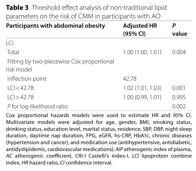 AO 人群中,AIP、Non-HDL-C 等 5 项参数与 CMM 呈线性正相关(非线性 P>0.05);LCI 呈非线性关联,拐点为 42.78,LCI<42.78 时风险随其升高而增加(HR=1.02),>42.78 时关联无统计学意义(HR=1.00)。非 AO 人群中,CRI-II 与 CMM 呈非线性关联,拐点为 4.06,拐点后风险显著升高(HR=2.07),拐点前无显著关联(HR=0.96)。