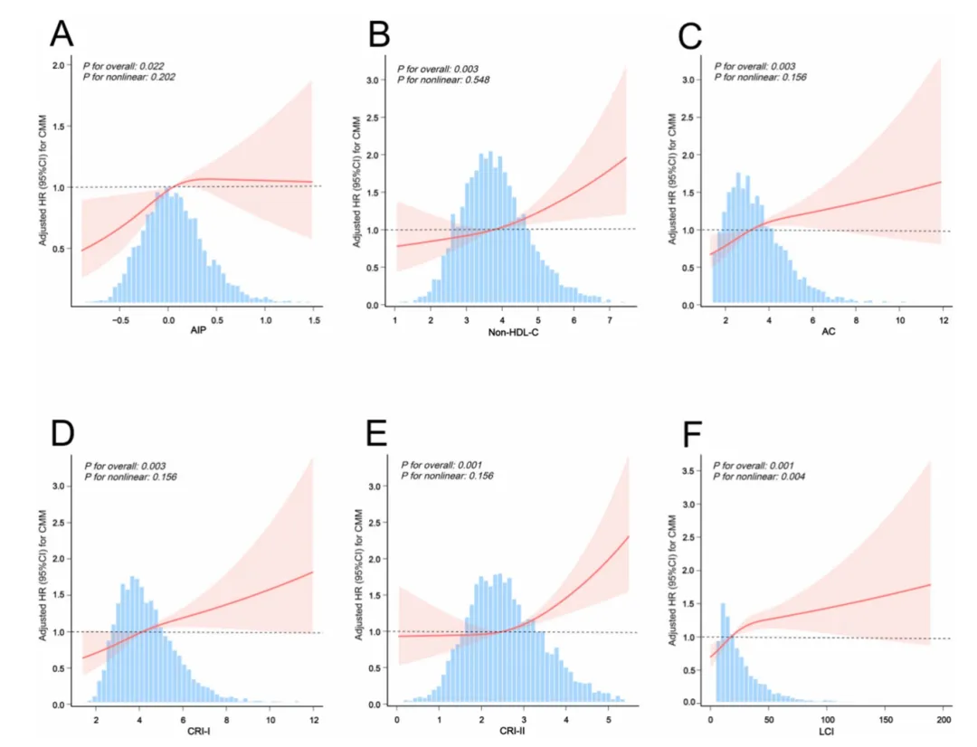 图3.非传统脂质参数与AO(A-F)参与者CMM风险之间的剂量-反应关系
