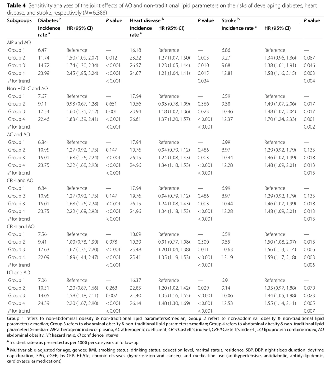 亚组分析显示,高血压与 AO、非传统脂质参数的联合作用存在交互效应(P<0.05),但各亚组(不同年龄、性别、BMI 等)均显示二者与 CMM 的密切关联;敏感性分析(含缺失数据处理、排除基线患病 / 用药人群等)均验证结果稳健,且二者联合对糖尿病、心脏病、中风的单独发病风险仍有显著影响(P<0.05)。
