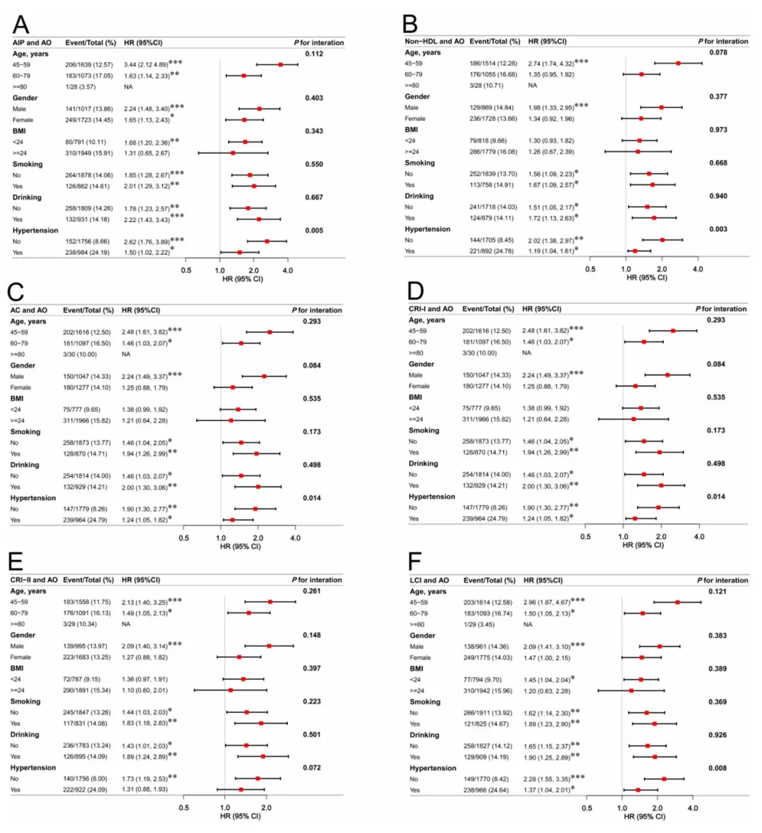 图4.基于腹部肥胖和非传统血脂参数(A-F)高水平的亚组,进行多变量调整的Cox回归分析森林图