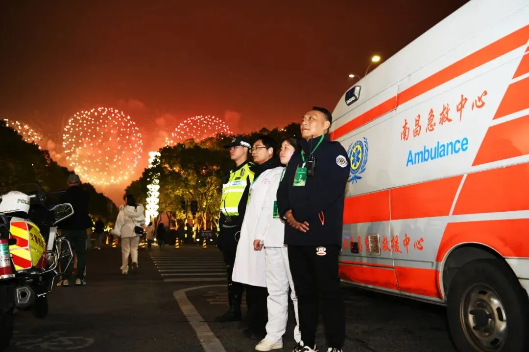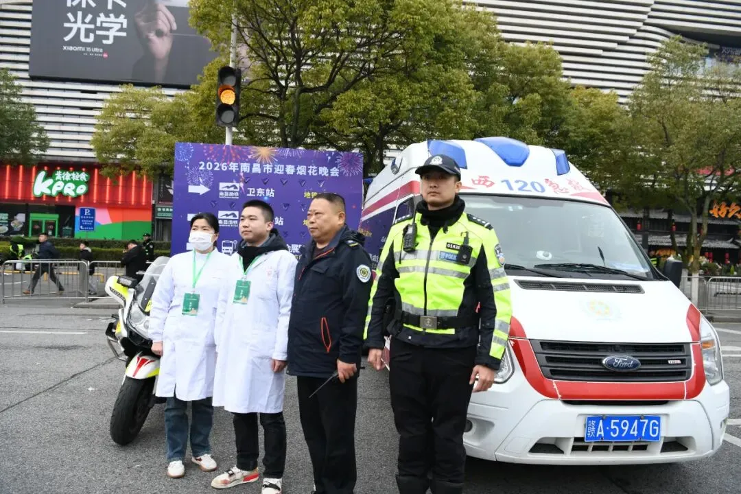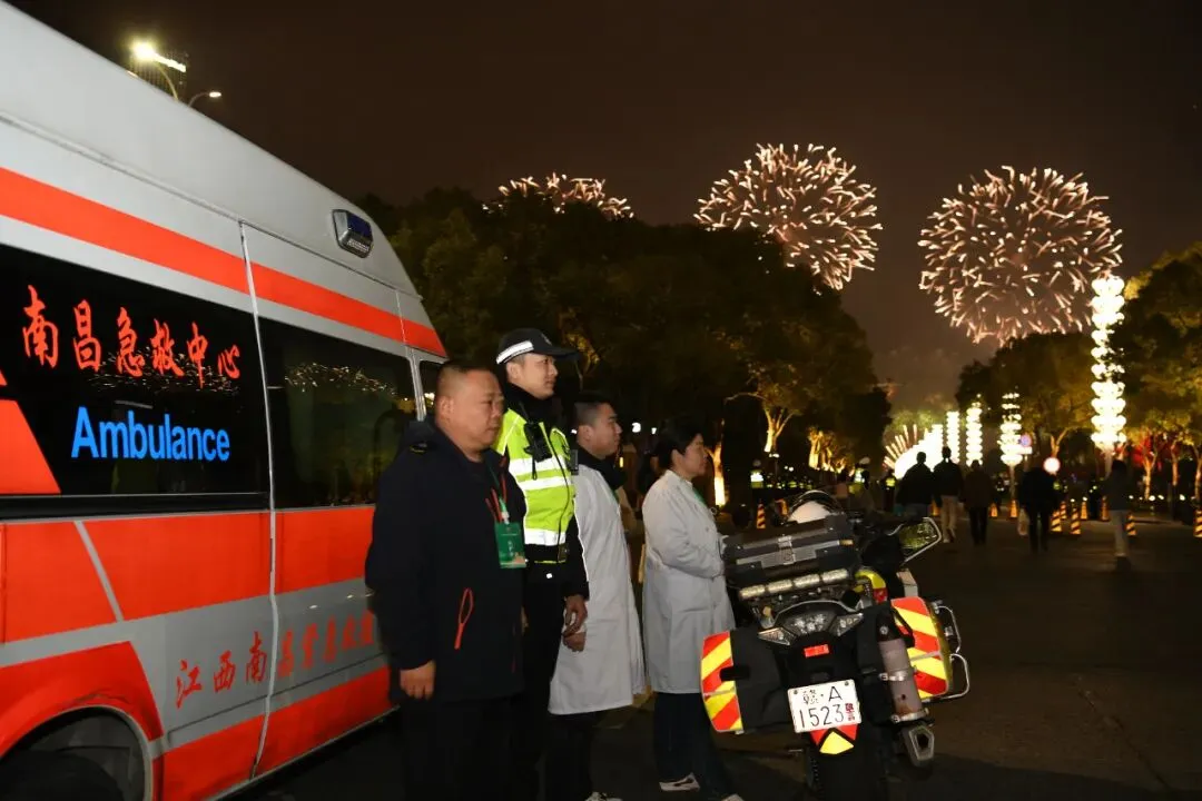 璀璨烟花之下,全体急救人员坚守岗位、严阵以待,始终保持高度戒备状态,用坚守与专业守护现场群众生命健康安全,累计转送患者12名。直至人群安全疏散完毕,保障队伍才有序撤离,以实际行动为这场新春盛宴筑牢坚实安全屏障。
