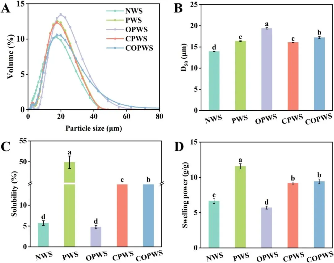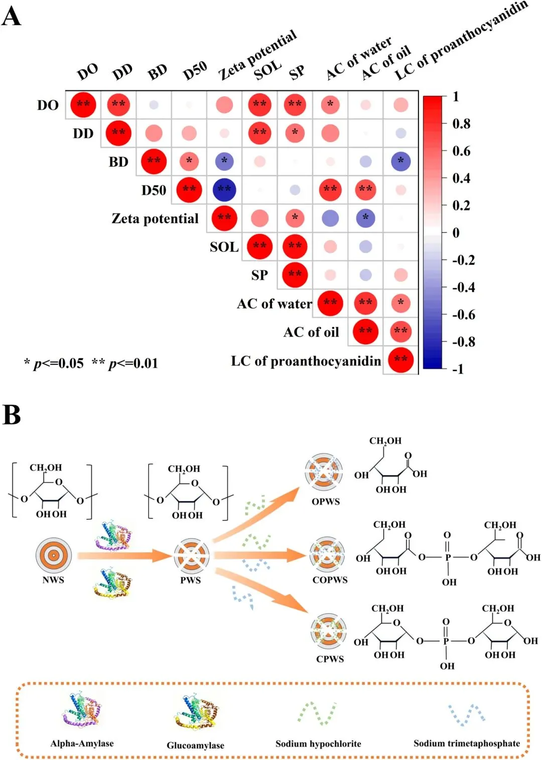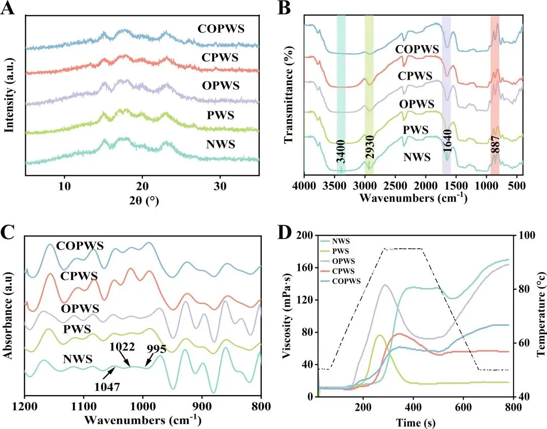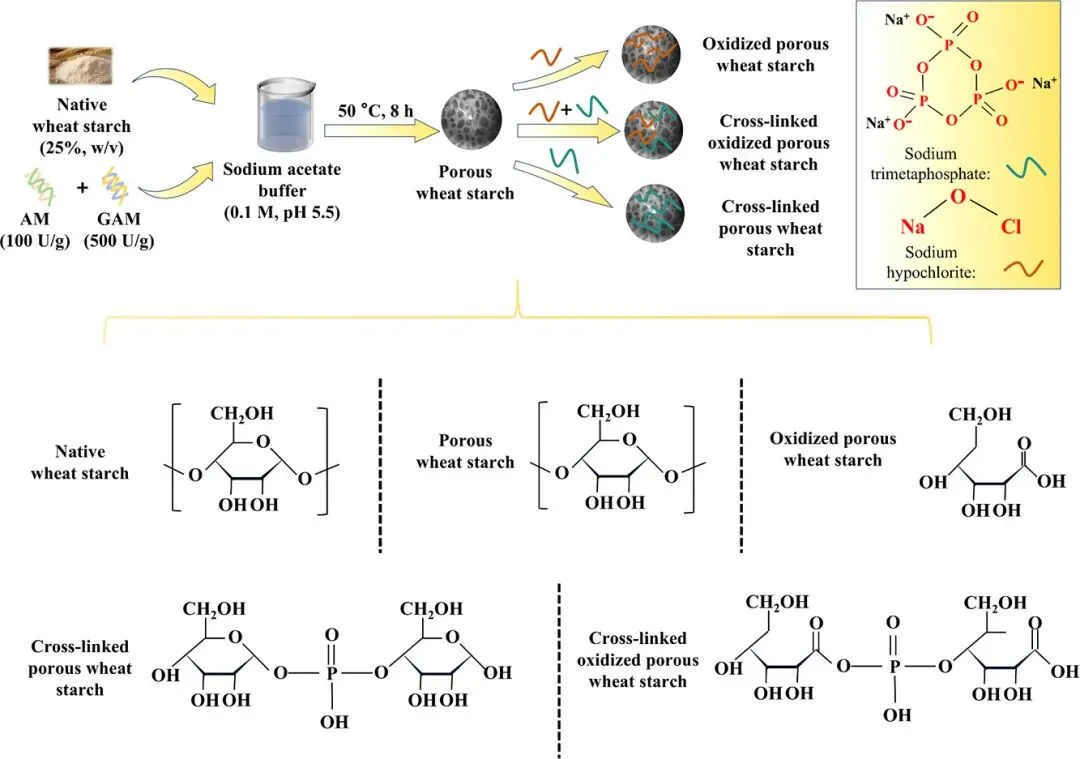 以多孔小麦淀粉(PWS)为对象,采用次氯酸钠(NaClO)氧化和三偏磷酸钠(STMP)交联双重改性策略,研究了其对淀粉多尺度结构、理化性质及功能性能的影响,揭示双重改性不仅保留了淀粉的A型晶体结构,还显著提升了其热稳定性、流变性能和吸附能力(水、油、原花青素),并揭示了一种“功能化-加固”协同机制。