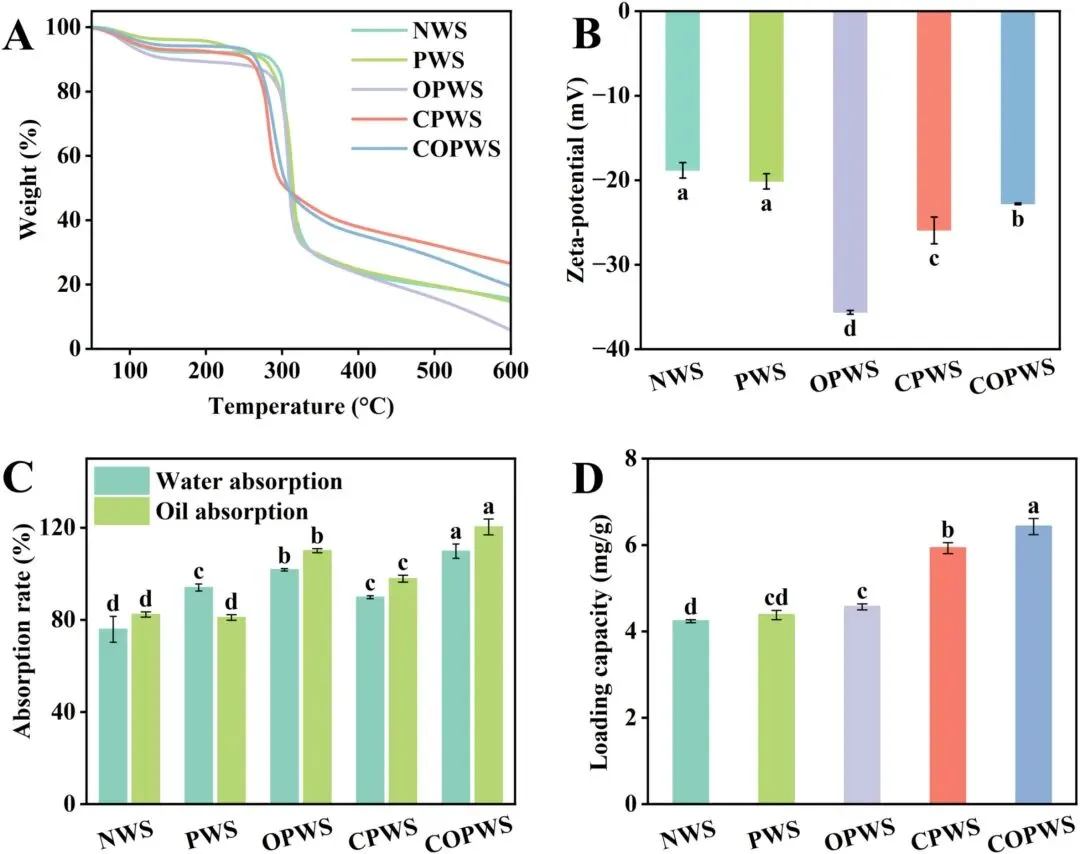Figure 6 Zeta电位、吸附性能与热重分析