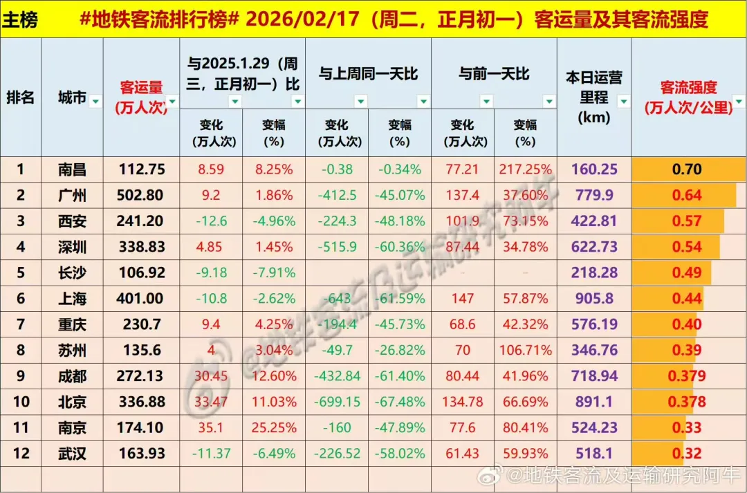 >真正的顶流!南昌地铁客流强度!再冲全国第一!!!
