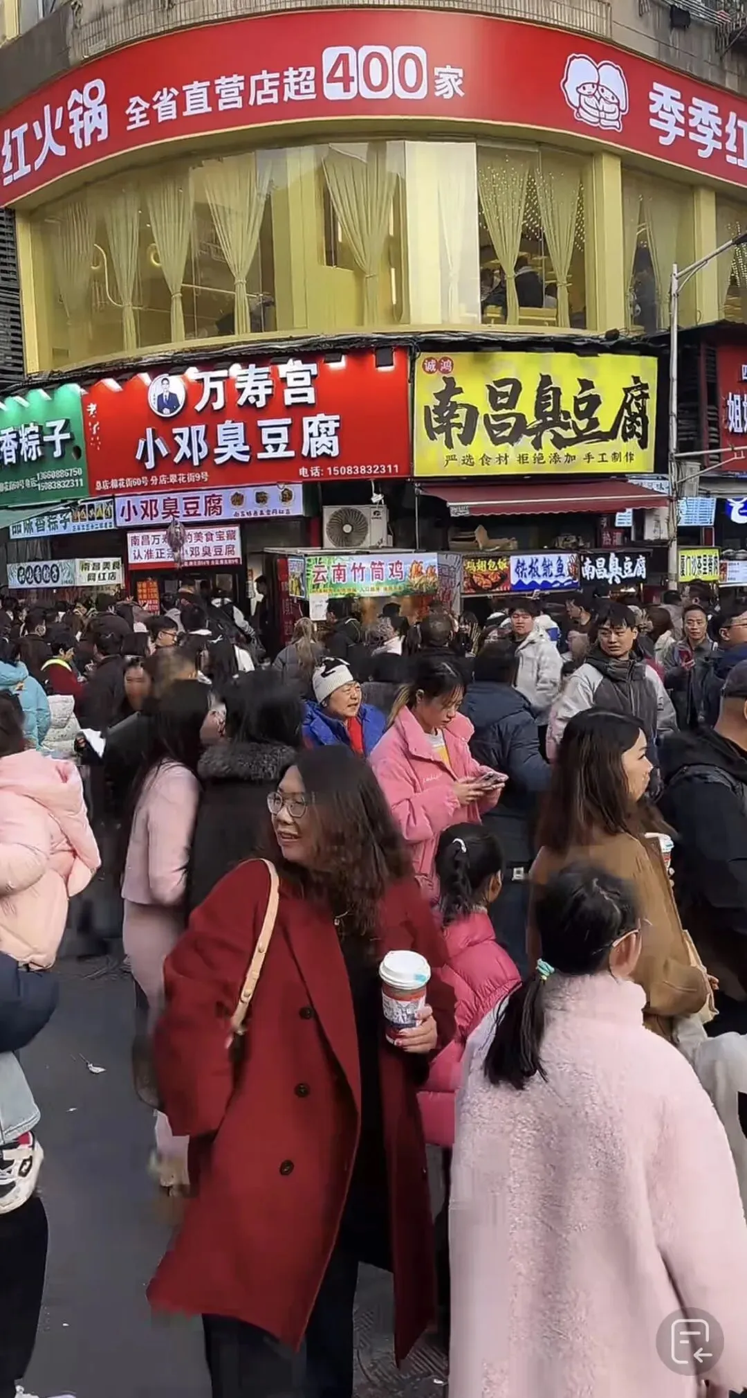 赣江东岸深红色区域主要为步行街、万寿宫、滕王阁,看有人直播确实人山人海。