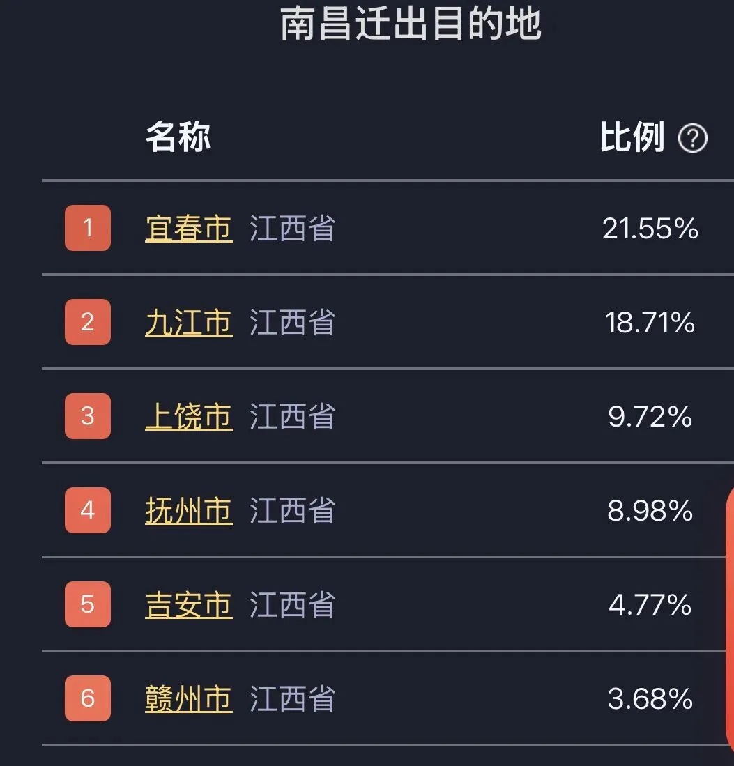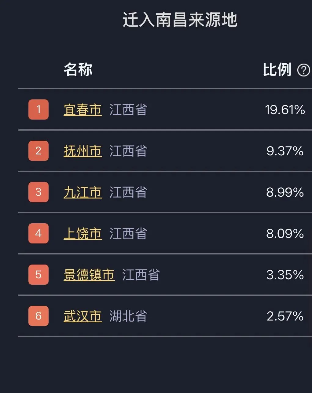 数据统计,2月18日,迁入南昌来源地TOP6城市中,除武汉市之外,其他5个迁入来源地均为省内城市,合计占比约49.41%。