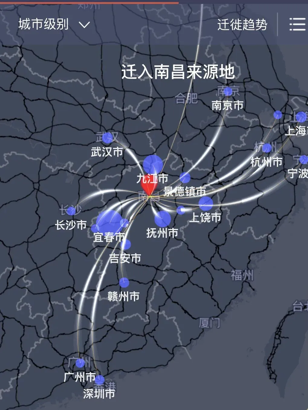 春节期间南昌迁出目的地、迁入南昌来源地的情况,很有意思。
