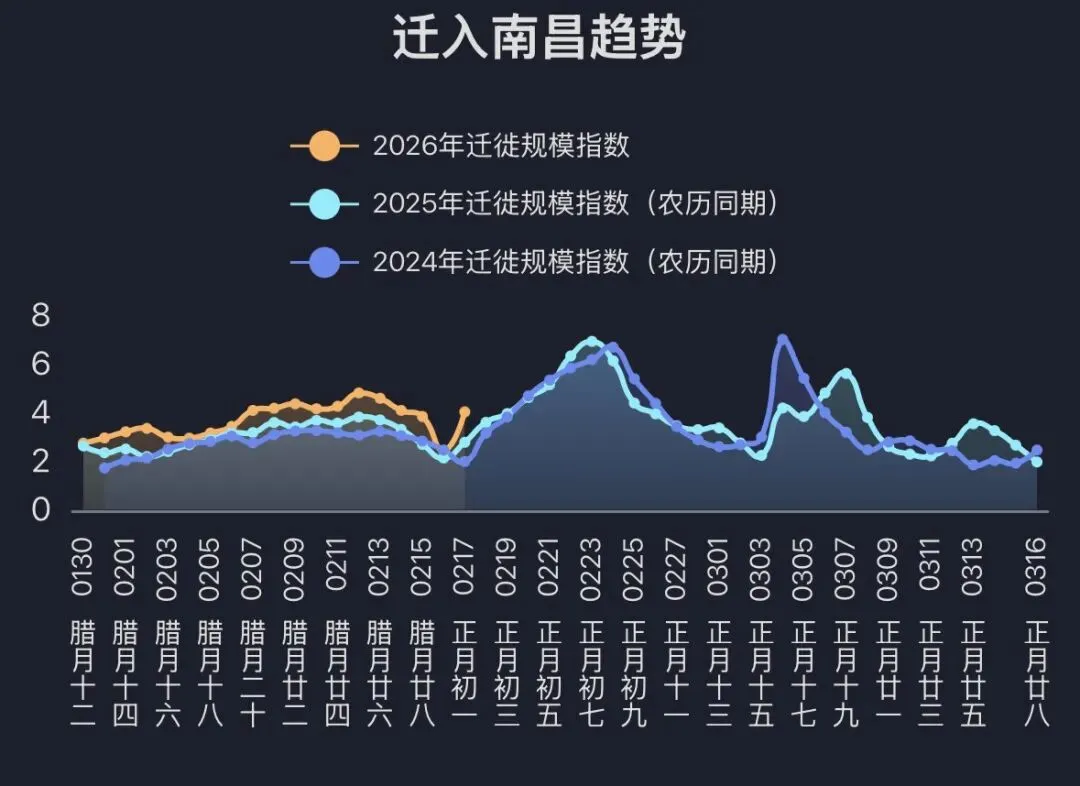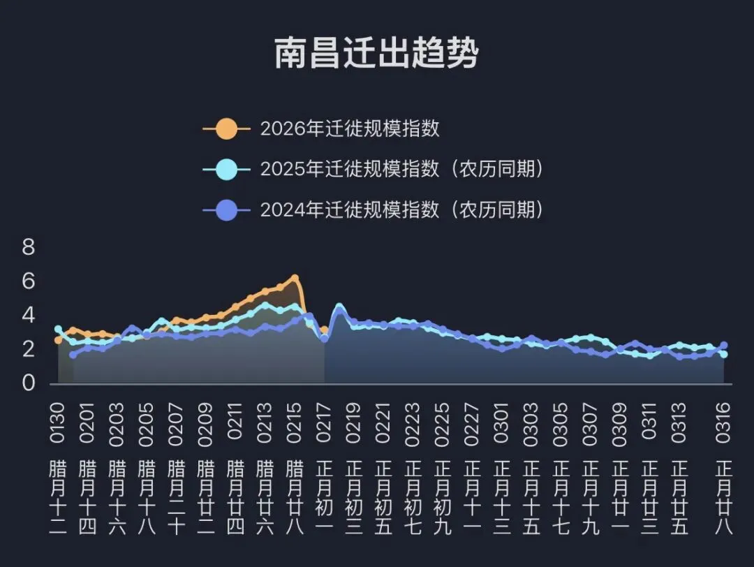 有意思的是,与2024年、2025年农历同期相比,2026年无论是南昌迁出的规模指数,还是迁入南昌的规模指数,均呈现上扬趋势。