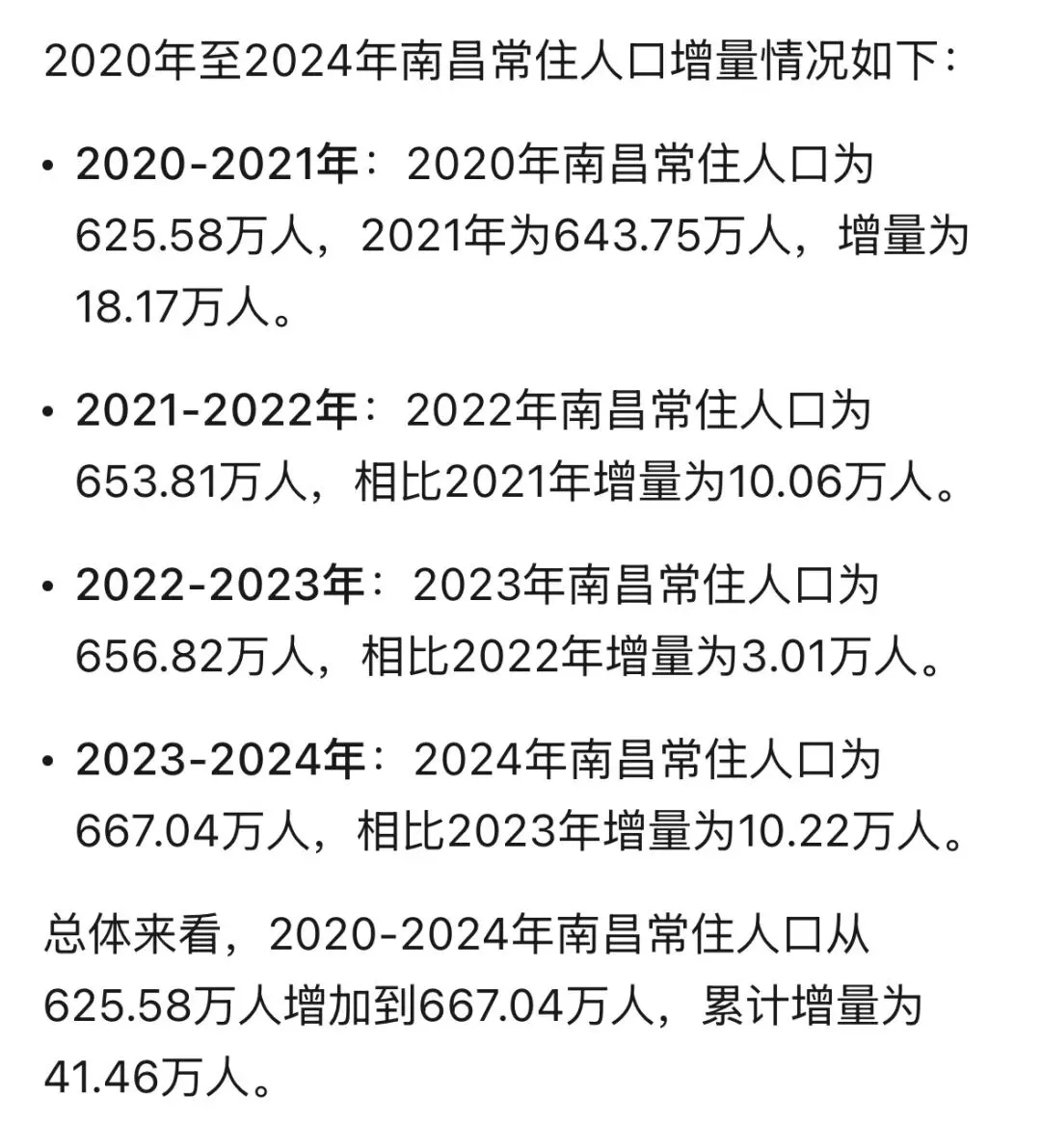 据统计,2020至2024年,南昌常住人口与户籍人口双双实现稳步增长,且连续多年保持净流入状态。特别是24年人口增量为10.22万,全国各大城市前列,南昌人流量越来越多这是不争的事实。