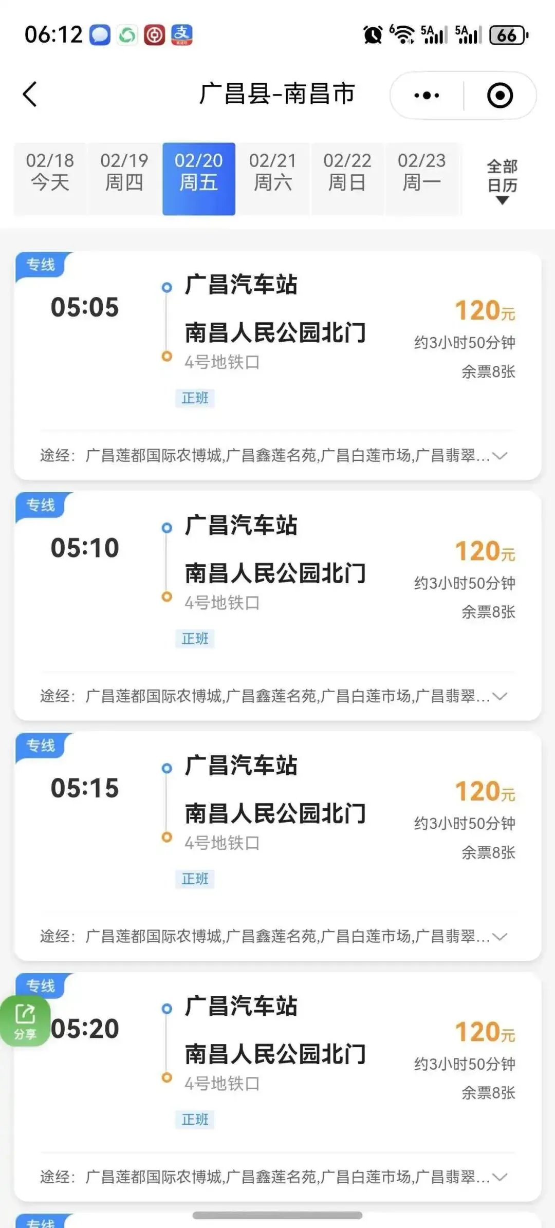 单人票价120元。有出行需求的市民朋友可到广昌县汽车站购票或通过“赣悦行”微信小程序购票乘车。