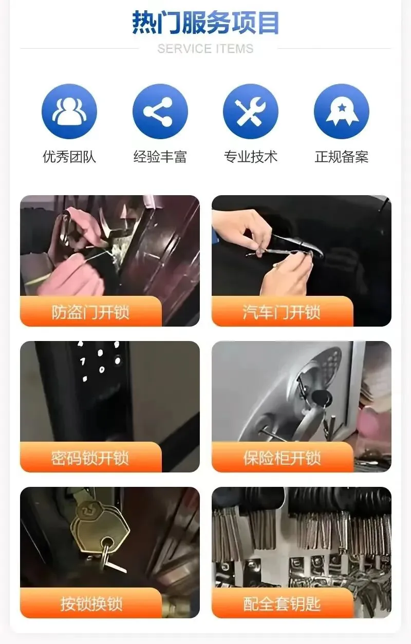 🔑 防盗门开锁(A级/B级/C级锁芯)🔑 室内门、卧室门、木门开锁🔑 汽车开锁(轿车、SUV、商务车)🔑 指纹锁/密码锁安装、维修与调试🔑 更换锁芯、锁体,提升防盗等级🔑 保险柜开锁及故障处理🔑 门锁维护保养与安全升级建议