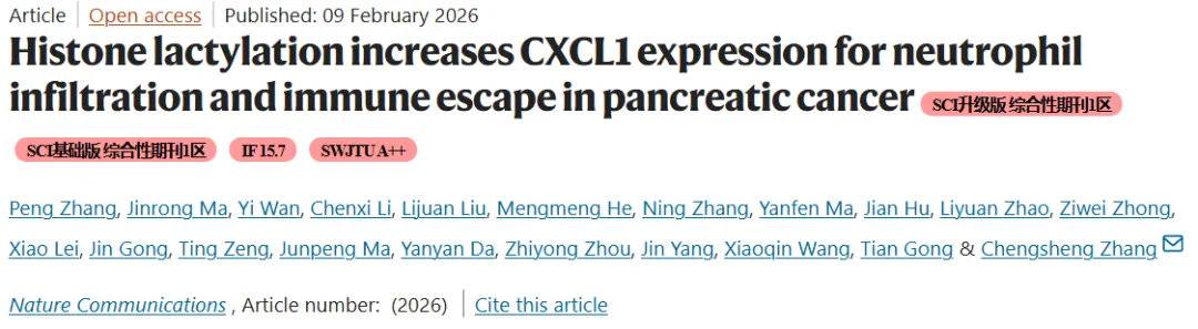 胰腺癌(PDAC)是癌症相关死亡的第三大原因,被称为“癌王”。其核心治疗困境在于:肿瘤微环境(TME)呈现极强的免疫抑制性,导致免疫检查点阻断(ICB)治疗效果甚微。此前研究已知,肿瘤细胞的“有氧糖酵解”(Warburg效应)是其代谢特征,但糖酵解如何通过表观遗传修饰调控免疫逃逸,一直是领域内未破解的关键问题。今天咱们分享的是南昌大学张呈生团队发表在Nature Communications(IF=15.7)的最新研究,该研究揭示了有氧糖酵解产生的乳酸经PCAF催化形成组蛋白H3K18乳酰化(H3K18la),进而转录上调CXCL1表达,最终招募中性粒细胞浸润肿瘤微环境并诱导免疫抑制的核心分子机制;研究首次证实PCAF是催化H3K18la的乳酰基转移酶,且PCAF抑制剂溴孢素与抗PD-1抗体的联合治疗在胰腺癌皮下和原位肿瘤模型中展现出显著的协同抗肿瘤效果,明确了Lactate-PCAF-H3K18la-CXCL1信号轴是胰腺癌免疫逃逸的关键通路,为胰腺癌的临床治疗提供了全新的靶点和组合治疗策略。